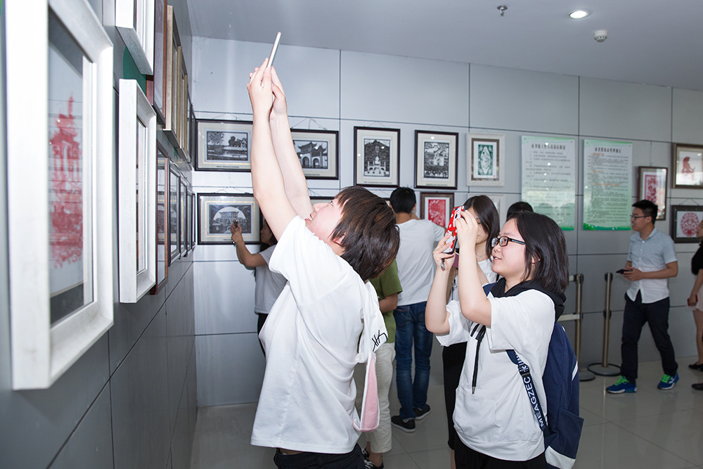 开幕式结束后,在场嘉宾和师生来到学校图书馆二楼大厅共同观看展览。各位艺术家们现场进行了剪纸表演,并与师生进行了互动。