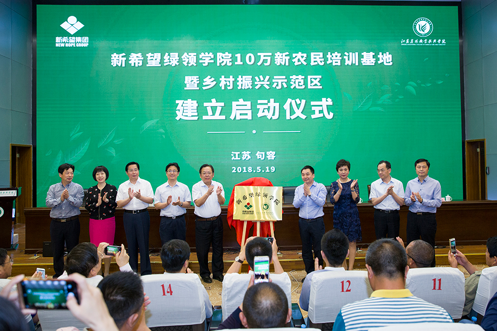 和10万新农民培训基地揭牌仪式在图书馆报告厅举行。江苏省农委主任杨时云、中央农广校副校长张丹梅、农业农村部科教司教育处处长纪绍勤、句容市委副书记高庆华、新希望集团常务副总裁李建雄、我院党委书记俞卫东、院长巫建华、副院长周兴元等参加了仪式并为基地揭牌。