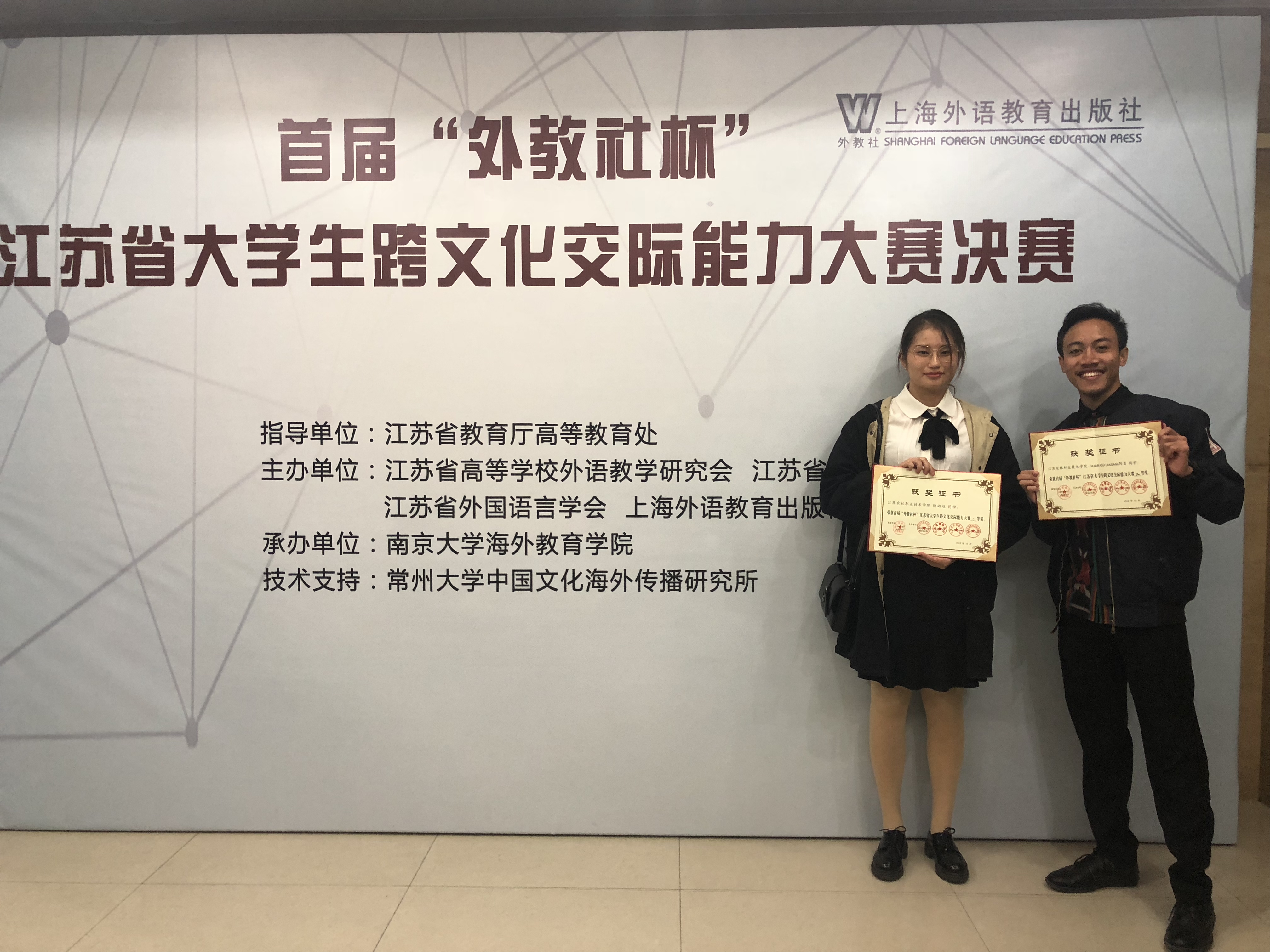 10月31日下午,首届“外教社杯”江苏省大学生跨文化交际能力大赛决赛在南京大学举行,我院2016商务日语班徐彬旭、2017级留学生FAJAR ADJI LAKSANA(阿吉)、2016动物医学1班刘宇辰分获高职日语组一等奖、高职留学生组二等奖、高职英语组二等奖的好成绩。我院洪滢、张娟、张五英、钱慧娟、徐航、尹文华六位老师获得优秀指导老师称号。