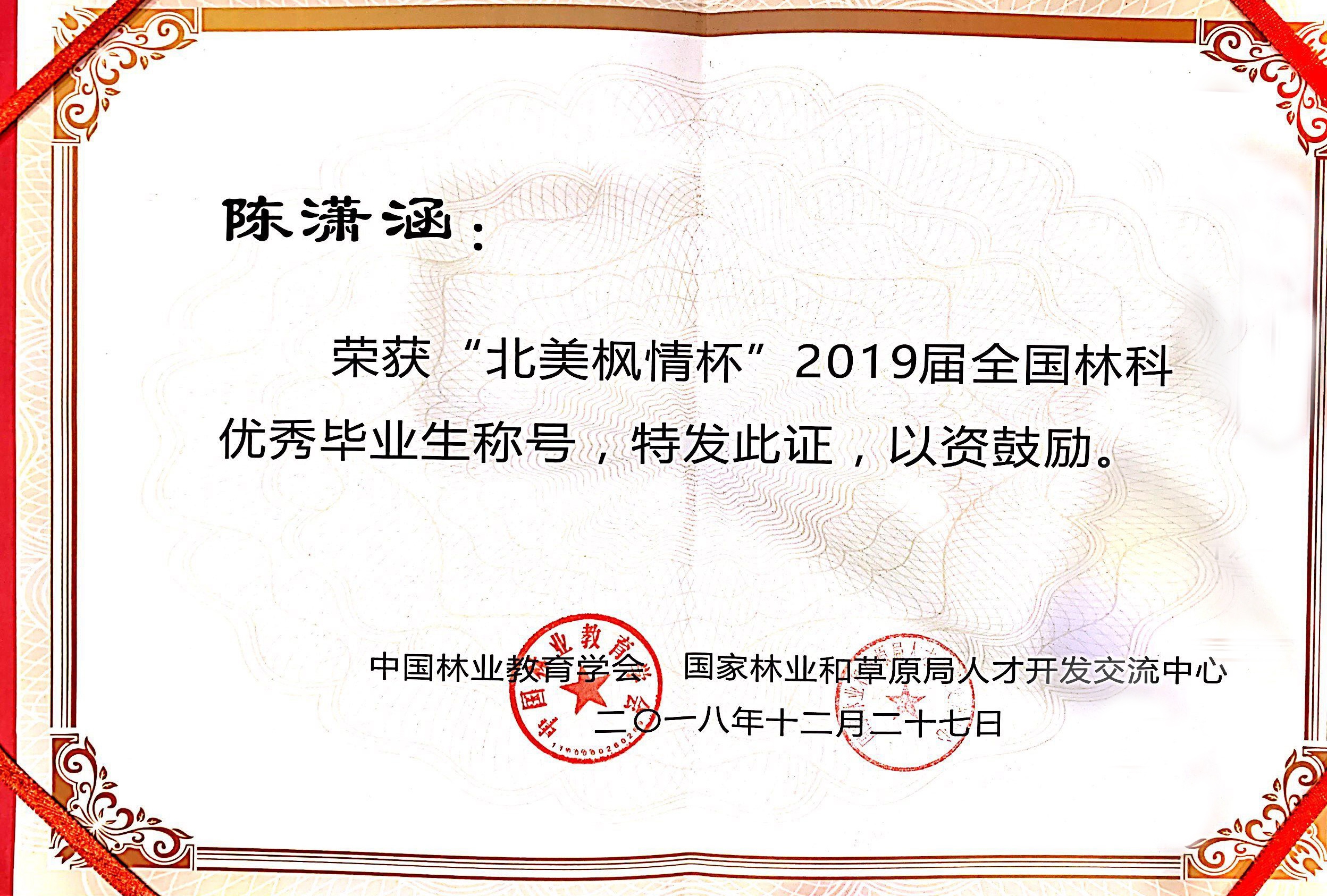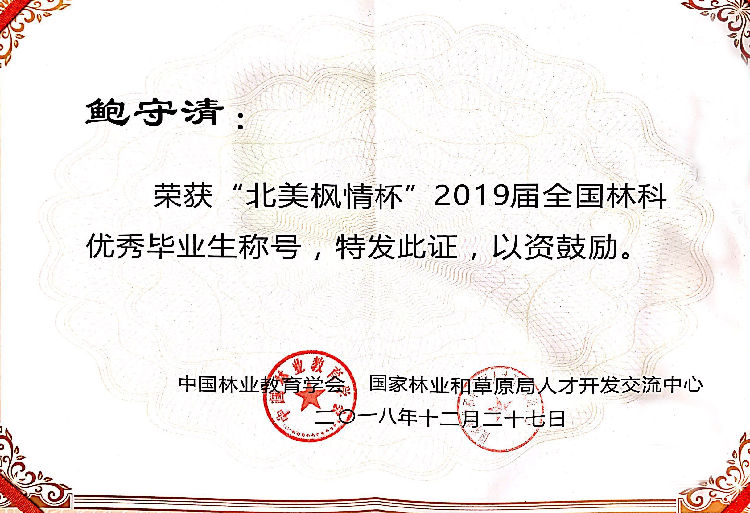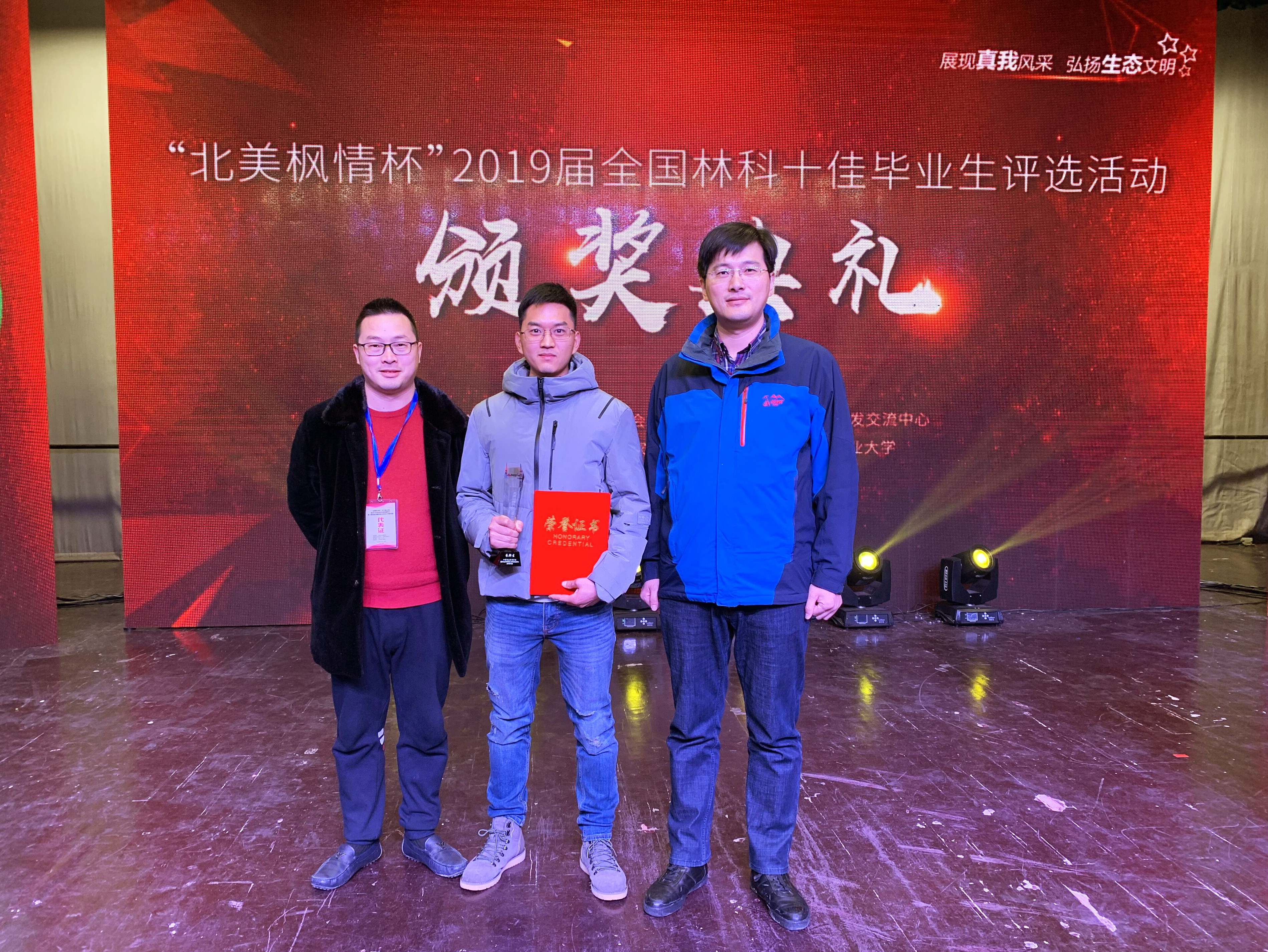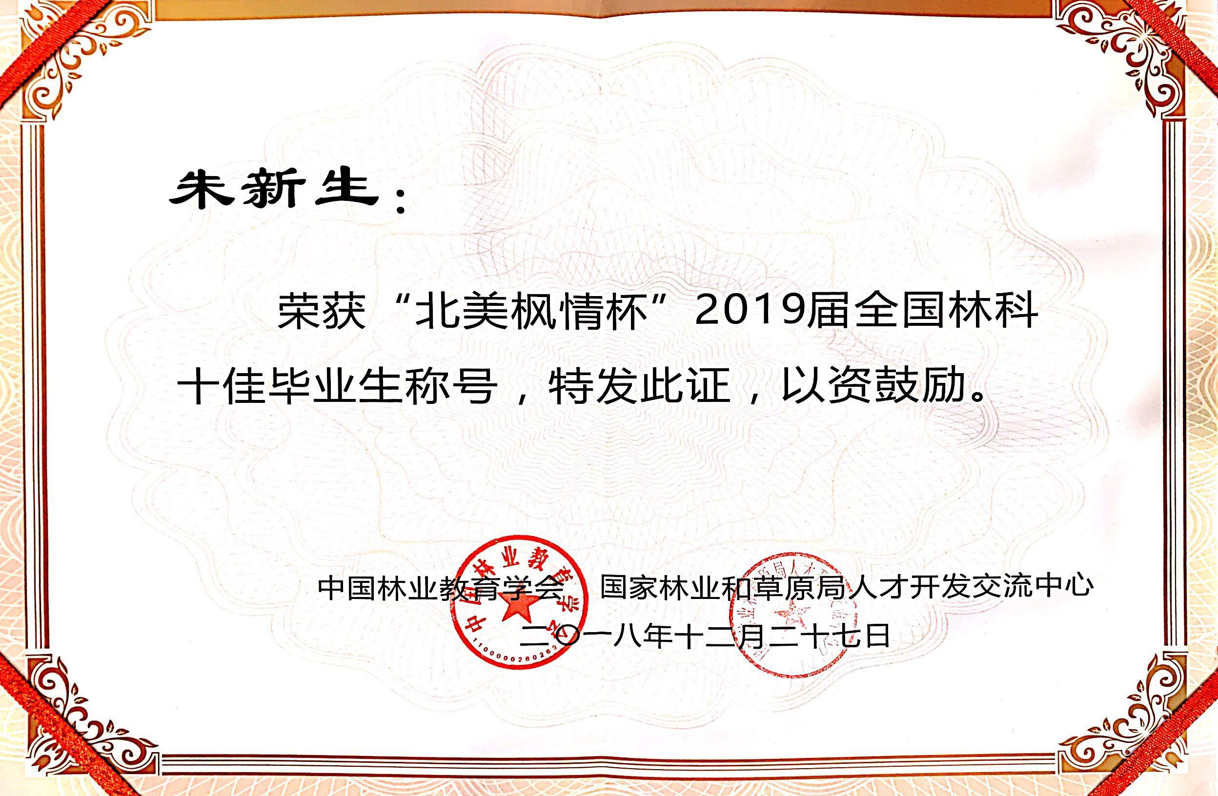 12月27日,由中国林业教育学会和国家林业局人才开发交流中心共同举办的“北美枫情杯”2019届全国林科十佳毕业生评选颁奖典礼在安徽农业大学举行,我院16园林技术专业朱新生同学荣获全国林科十佳毕业生称号,并作为优秀代表应邀参加颁奖典礼。此外,我院2019届毕业生陈潇涵、鲍守清、吴苏东、崔艺萌、王志等5名同学荣获全国林科优秀毕业生称号。