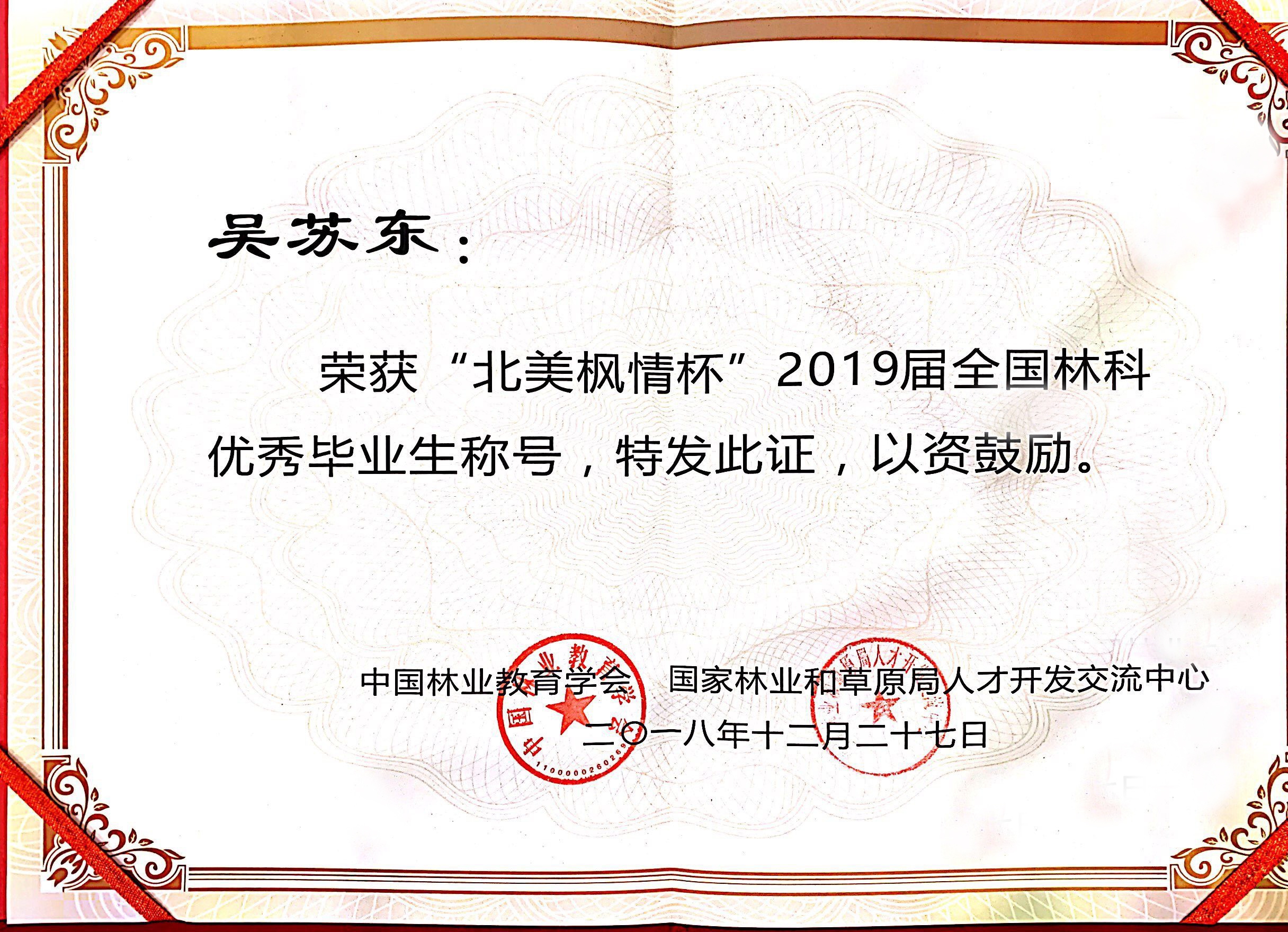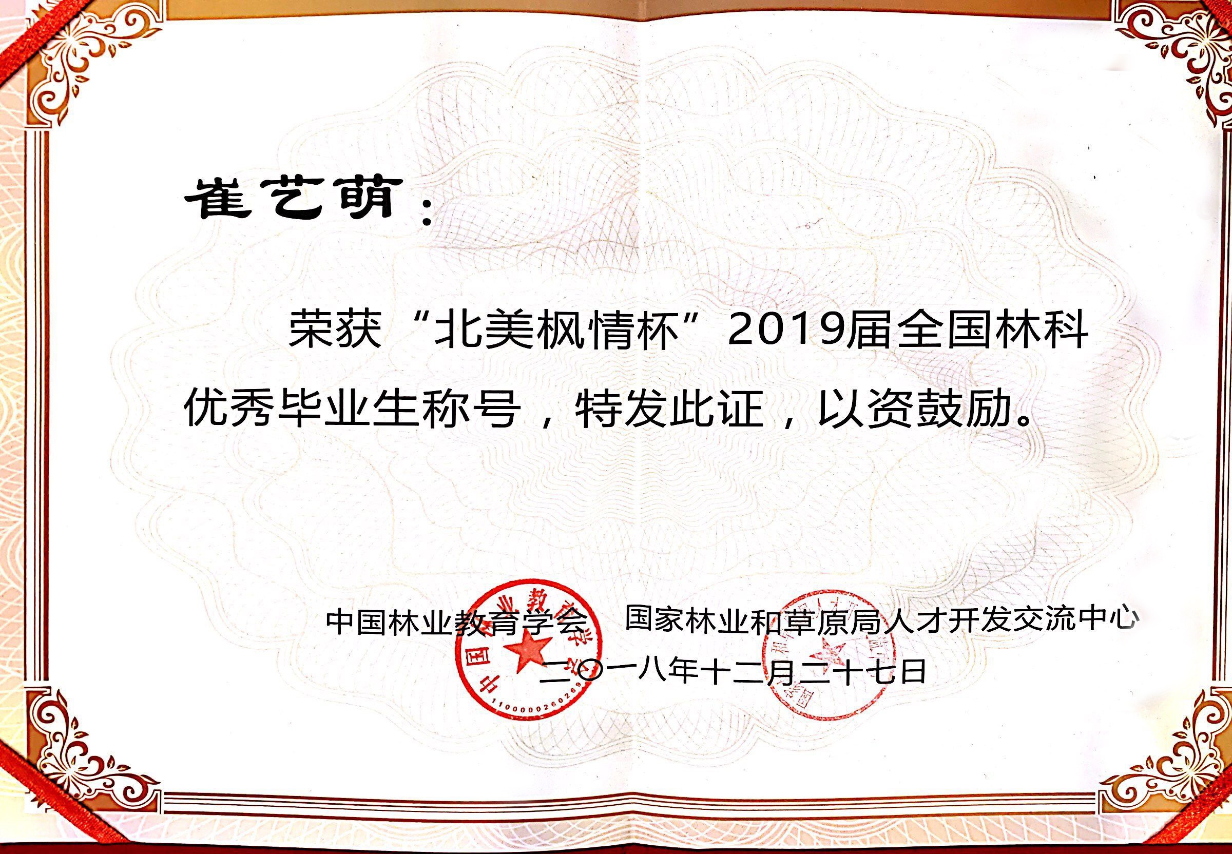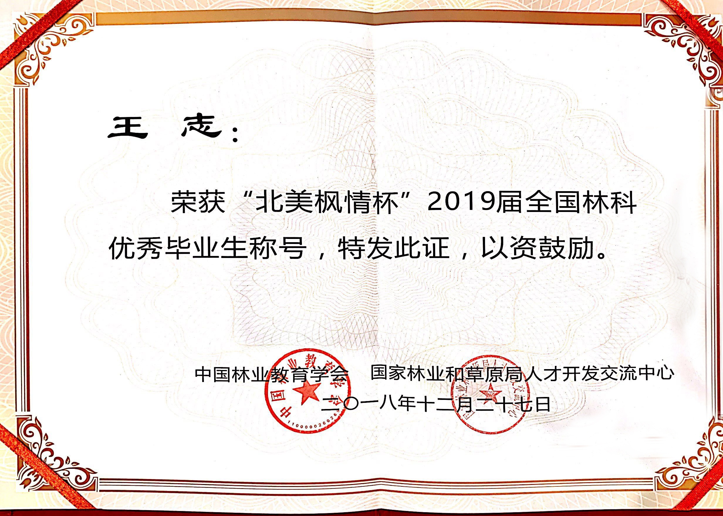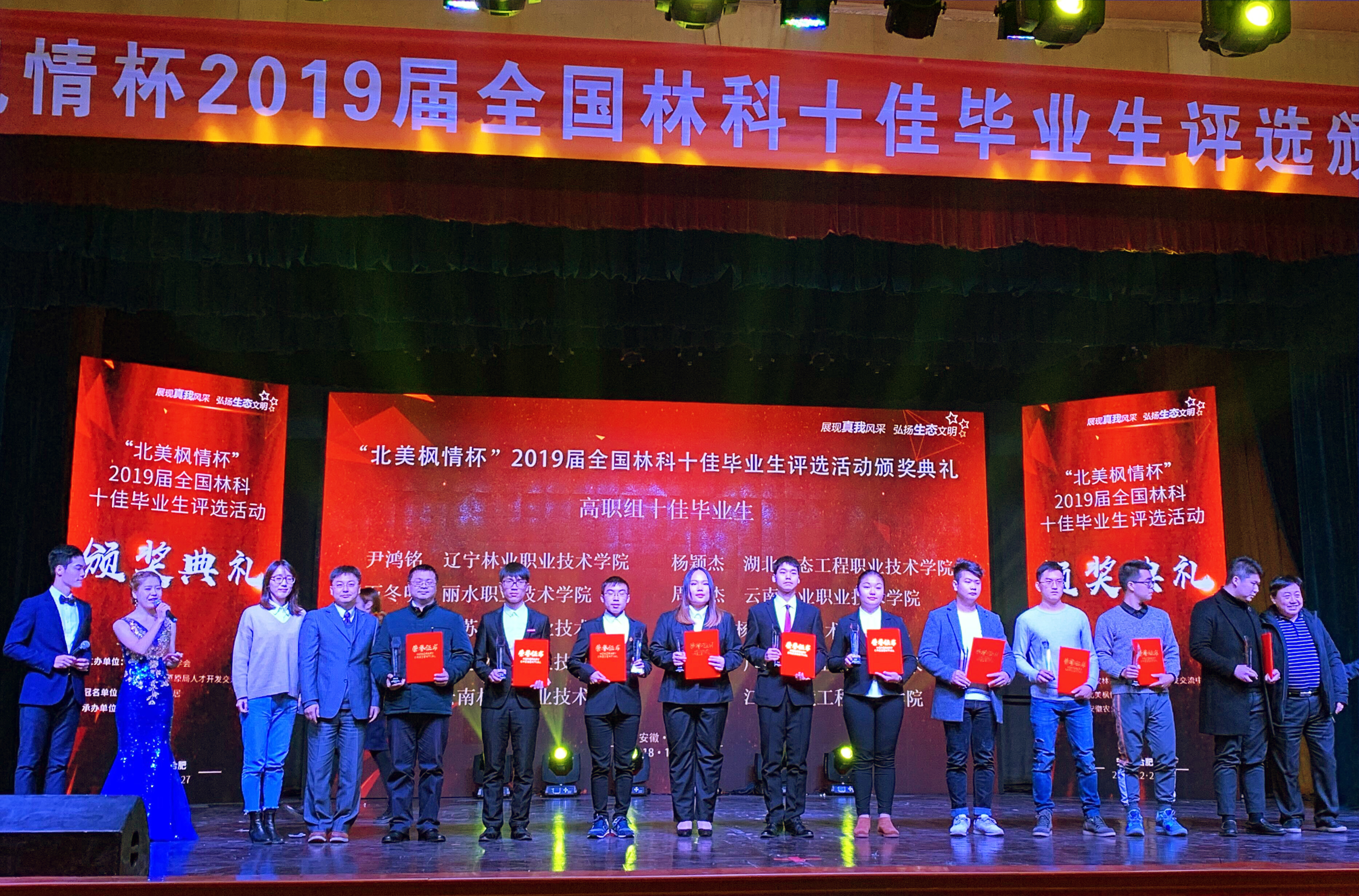 12月27日,由中国林业教育学会和国家林业局人才开发交流中心共同举办的“北美枫情杯”2019届全国林科十佳毕业生评选颁奖典礼在安徽农业大学举行,我院16园林技术专业朱新生同学荣获全国林科十佳毕业生称号,并作为优秀代表应邀参加颁奖典礼。此外,我院2019届毕业生陈潇涵、鲍守清、吴苏东、崔艺萌、王志等5名同学荣获全国林科优秀毕业生称号。