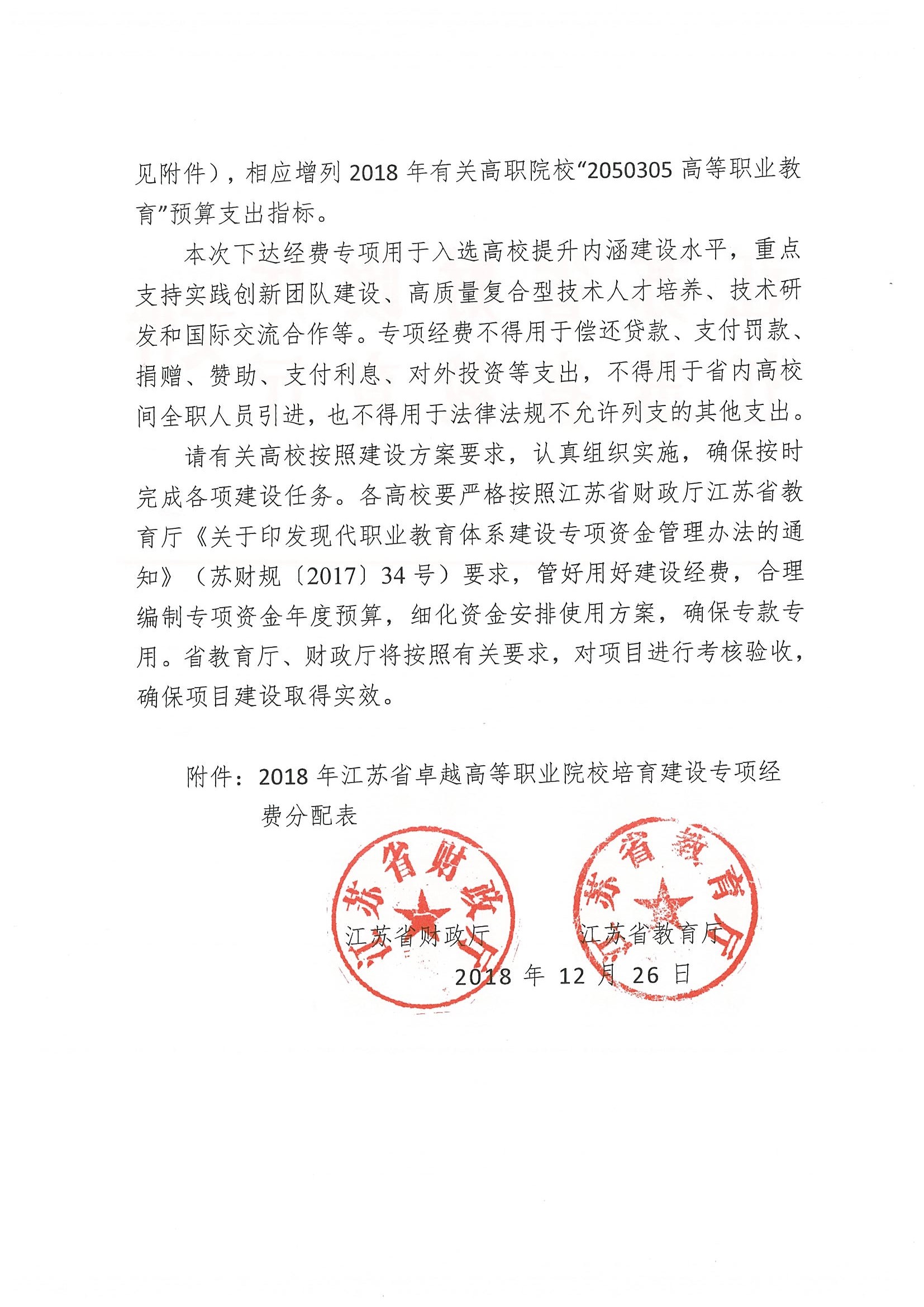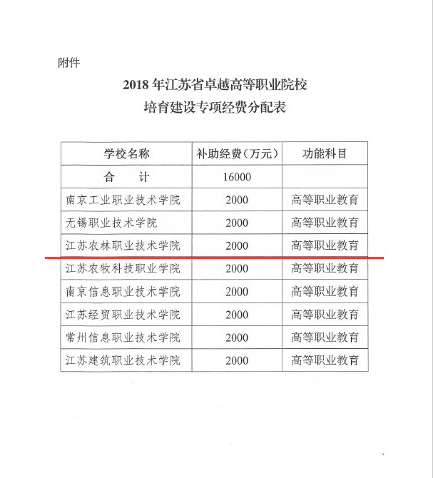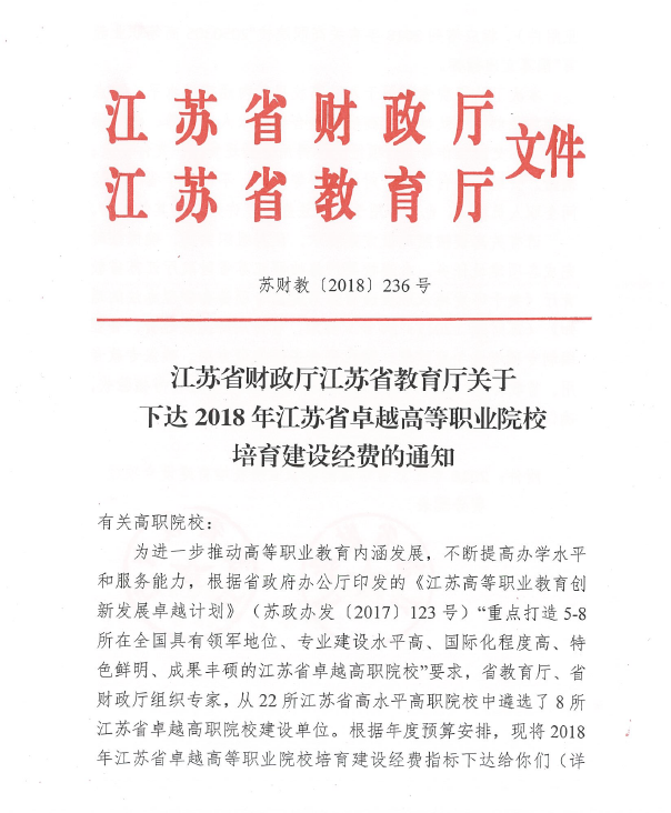 根据省政府办公厅印发的《江苏高等职业教育创新发展卓越计划》(苏政办发(2017)123号)“重点打造5-8所在全国具有领军地位、专业建设水平高、国际化程度高、特色鲜明、成果丰硕的江苏省卓越高职院校”的目标要求,省教育厅、省财政厅组织专家,从22所省高水平高等职业院校中遴选出8所综合办学实力雄厚和办学特色鲜明的“江苏省卓越高职院校建设单位”,我院成功入选。