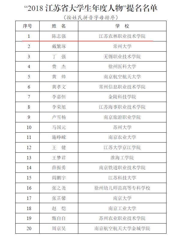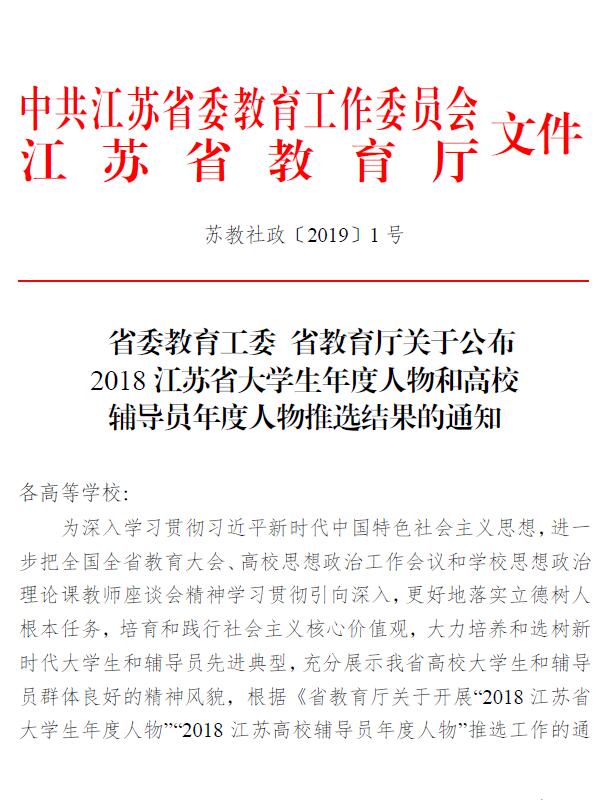 6月22日下午,由中共江苏省委教育工委、江苏省教育厅主办的2018江苏省大学生年度人物和高校辅导员年度人物颁奖典礼在扬州大学举行。经过色花堂 初评推荐、两轮专家评审、风采展评、网络推选,我院陈志强同学荣获“2018江苏省大学生年度人物”提名奖。