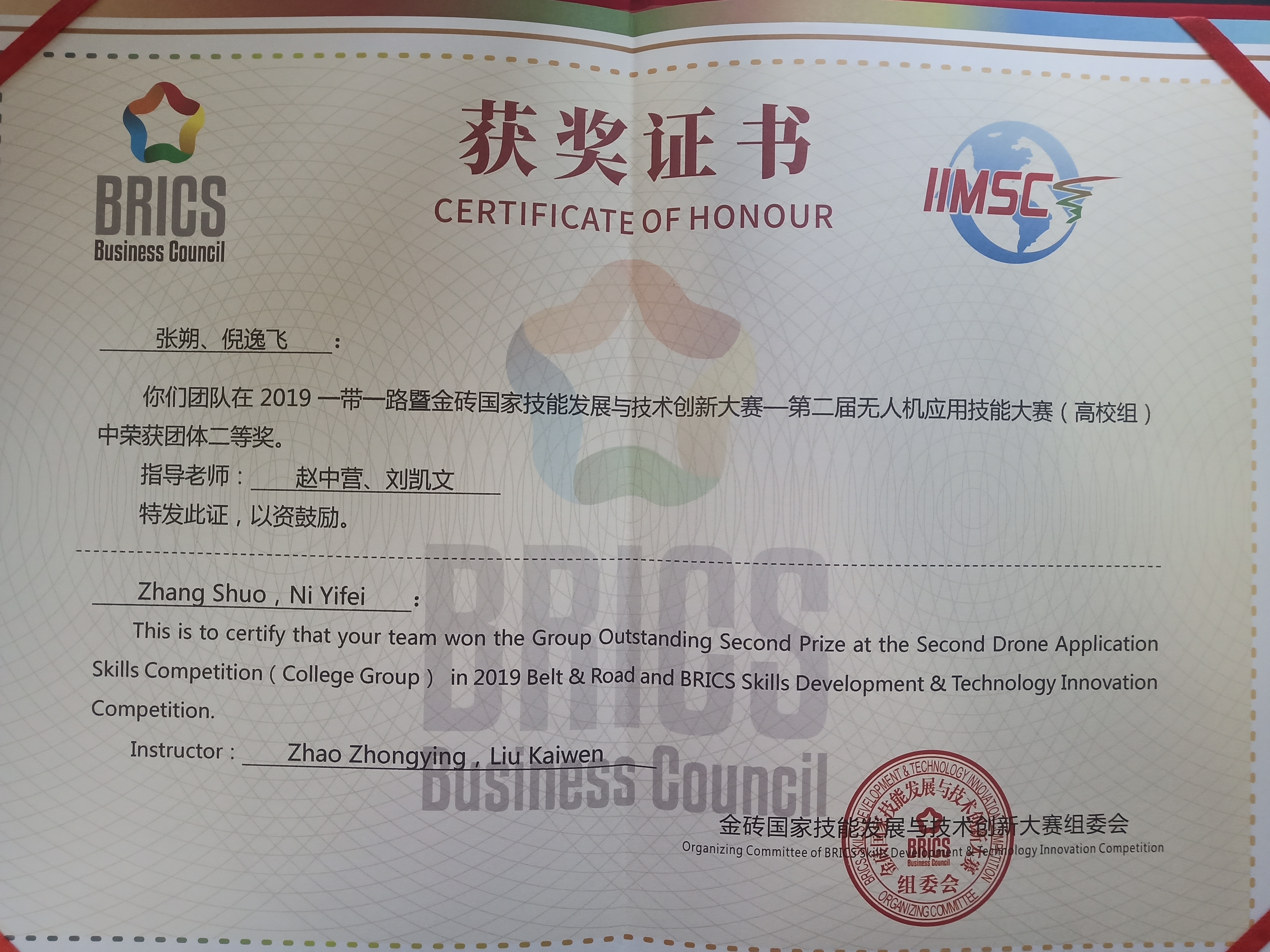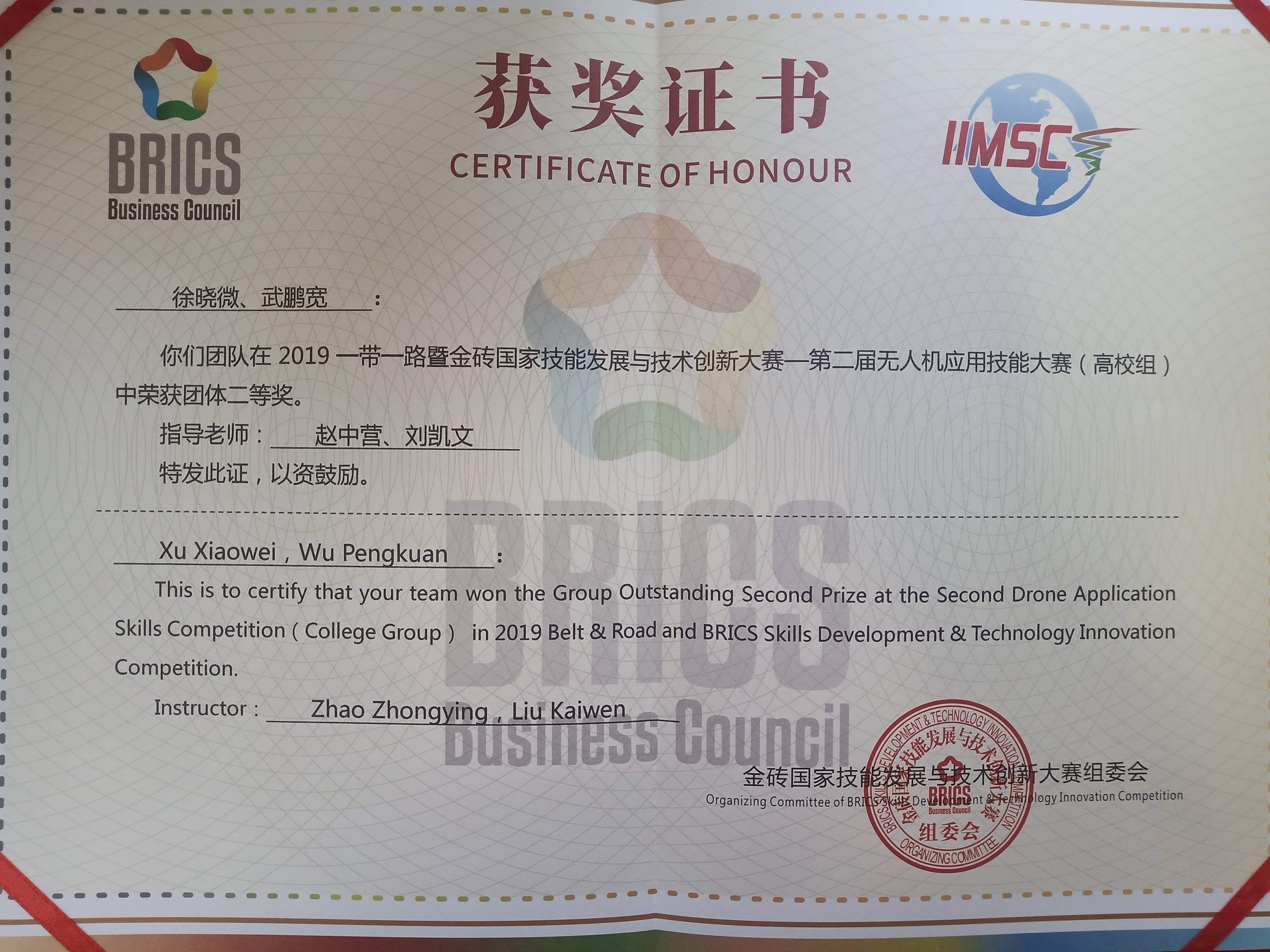 近日,2019年“一带一路”暨金砖国家技能发展与技术创新大赛在山东潍坊职业技术色花堂 举办。我院选派了两组参赛队4名同学参加了“无人机应用技能大赛”赛项的比赛,经过4天时间的激烈角逐,最终以优异的成绩两支参赛队均获得二等奖。