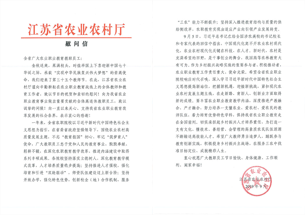 在这金桂飘香、秋菊溢彩的美好时节,我们迎来了全国第35个教师节,在此佳节来临之际,江苏省农业农村厅特发来慰问信,向我院全体教职员工致以节日的祝贺和亲切的慰问!全文如下: