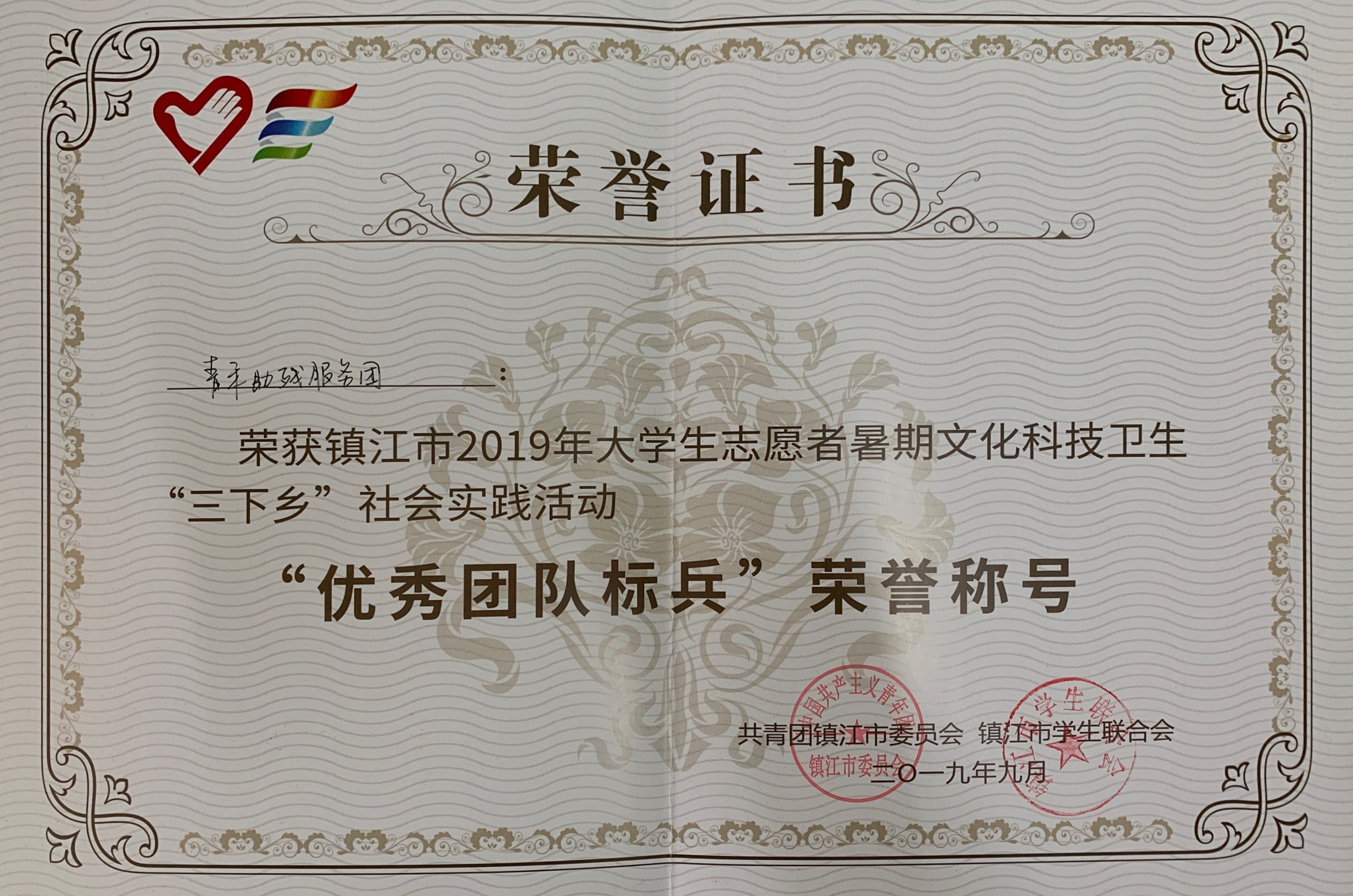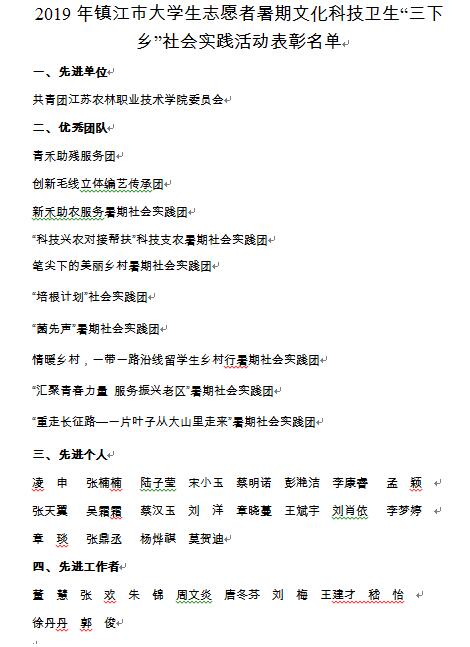 近日,镇江市大中专学生志愿者暑期文化科技卫生“三下乡”社会实践活动评选结果公布,我院团委荣获先进单位,“青禾助残服务团”获优秀团队标兵,“培根计划”暑期社会实践团等10支团队获优秀团队,王斌宇等20名同学获先进个人,唐冬芬等10名老师获先进工作者。
