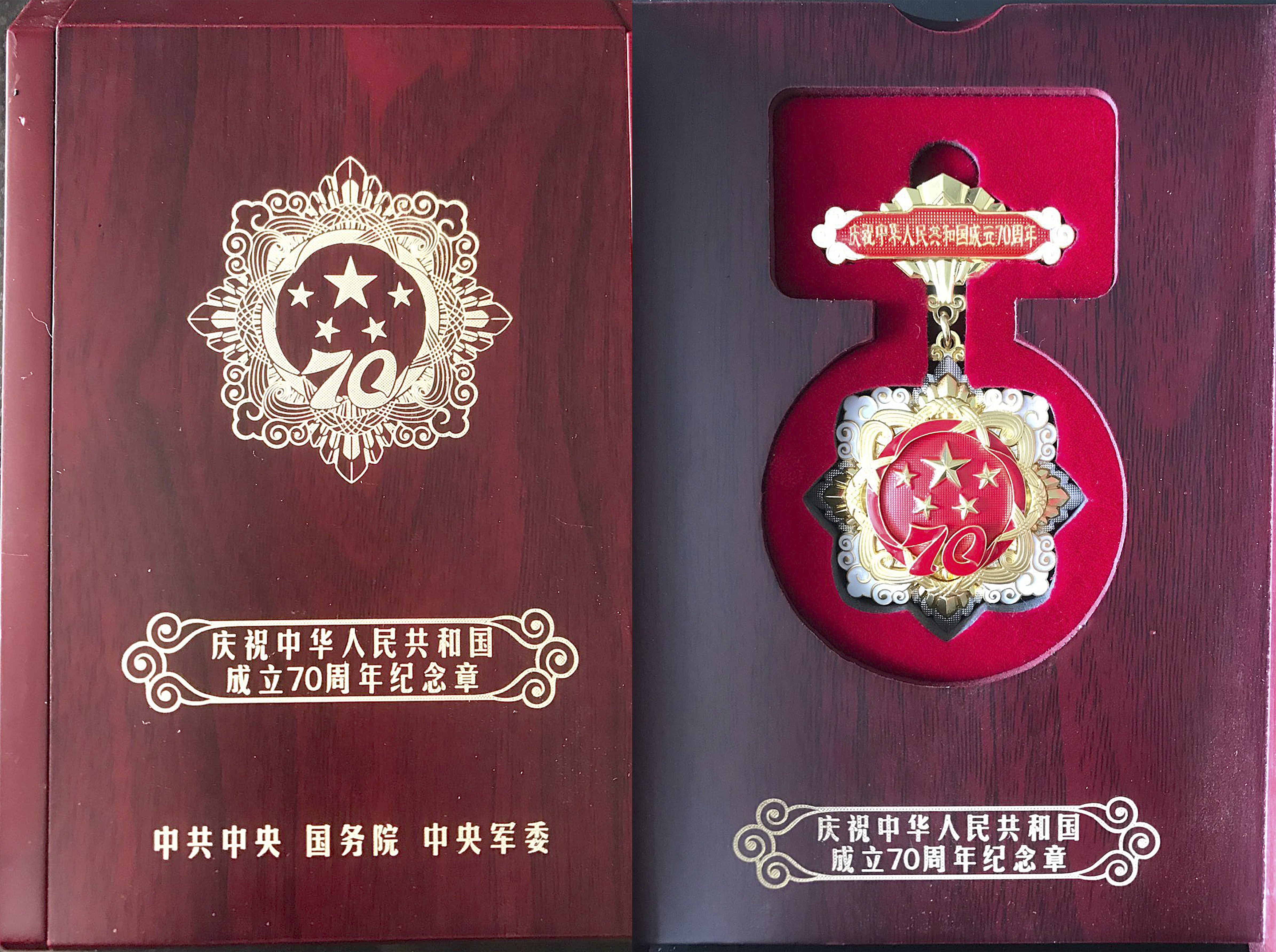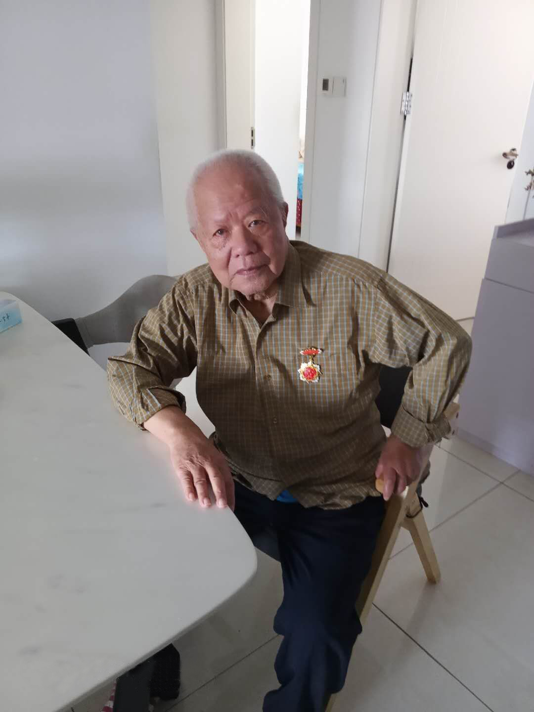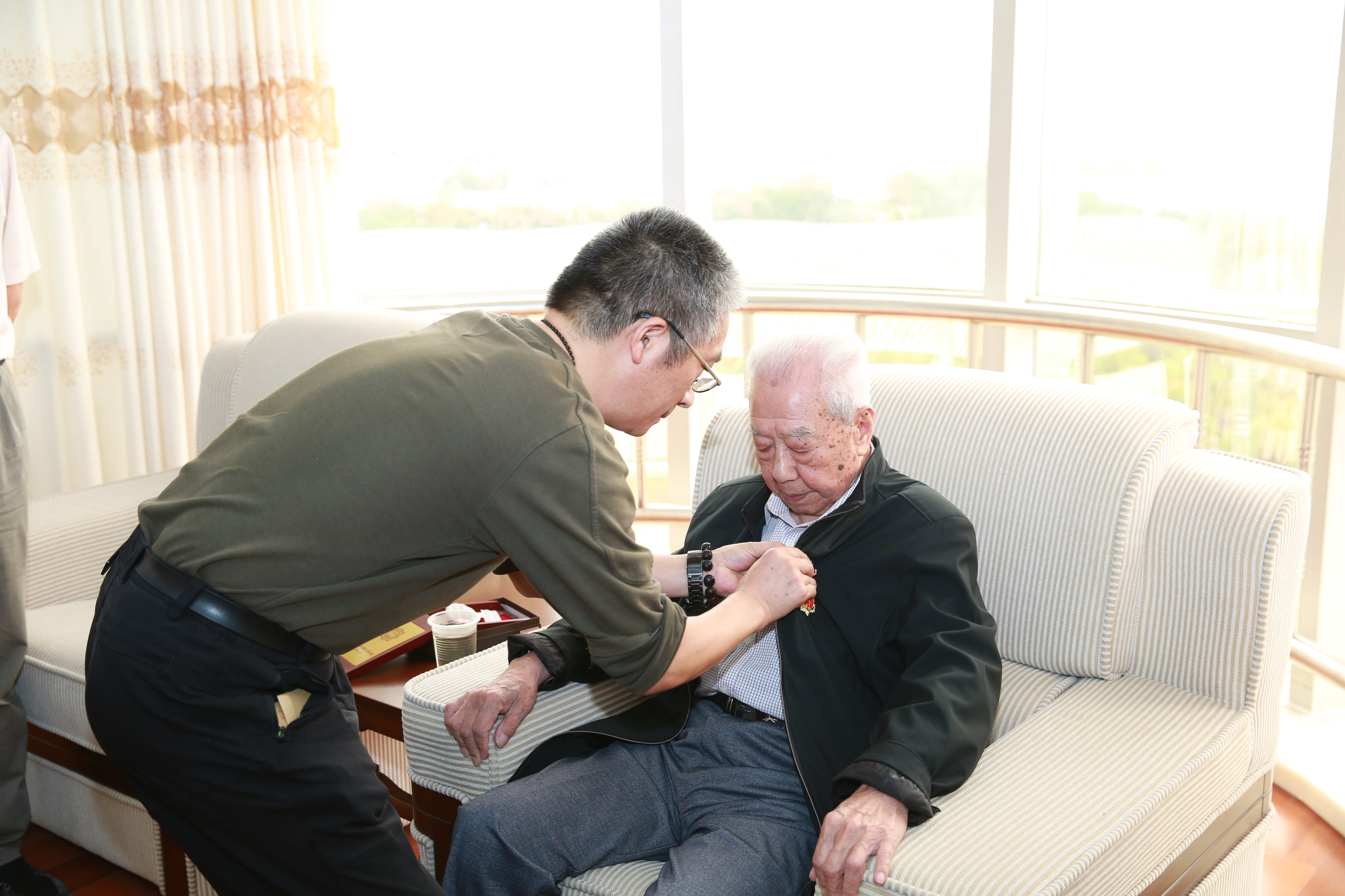 金灿灿、沉甸甸的纪念章铭刻着革命前辈的光辉足迹和无尚荣光。两位老师戴着纪念章,精神矍铄,他们感谢党和政府对他们的关怀,感谢组织对他们的祝福与挂念。他们身上展现出来的伟大抗战精神是我校宝贵的精神财富,永远激励着全校师生自强不息、奋发有为。