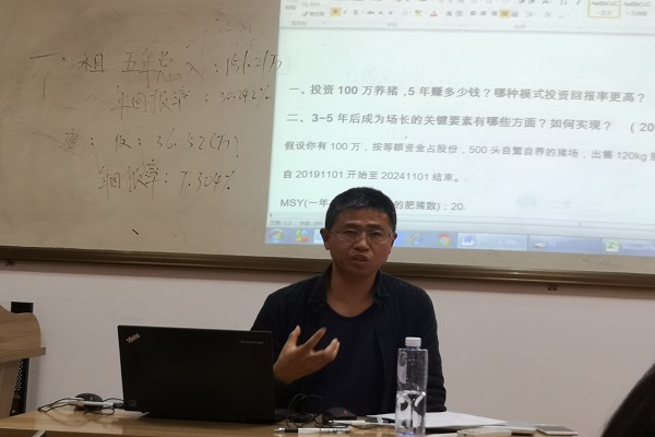 参会的40名同学分成五组,各组选择一种猪场养殖模式,支配100万元创业基金,设计出财务计划与投资收益分析,进行PK。通过每组的答辩,评委将给出创业支持金额,根据获得的投资金额多少进行排序,获得投资金额最多的小组为第一名。活动历时3个小时,大家在展示创业技能的同时,也学到了很多创业知识以及养殖技能。