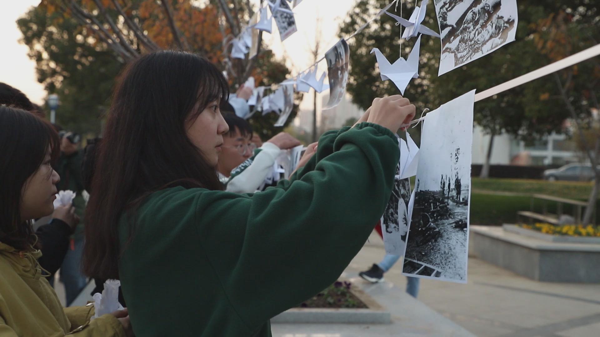 活动开始前,同学们认真了解了国家公祭日设立的重要意义和南京大屠杀等重要历史事件,经过充分的交流,同学们心中都充满了对遇难者的哀悼之情。学生代表慷慨激昂地朗诵了《和平宣言》,“巍巍金陵,滔滔大江,钟山花雨,千秋芬芳。一九三七,祸从天降,一二一三,古城沦丧。侵华倭寇,掳掠烧杀……”,一字一句将大家带回那段难忘的历史。随后,同学们怀着无比沉重的心情,共同参观了南京大屠杀照片展。一张张骇人的黑白色照片,形成一条历史长廊,跨越时空,将一幕幕惨烈的事件再现到同学们的面前,告诫大学生:吾辈当自强。同学们感悟深刻,将成长寄语和祈福千纸鹤悬挂在遇难同胞的照片旁,千纸鹤随风摆动,寓意着同学们对遇难者的哀悼和对和平的呼唤。白绢花寄哀思,红手印表决心。活动中,同学们将手中的“哀悼花”一一粘在横幅上,上百朵白花簇拥正义,铭记历史国耻。同学们将红色的手印按在“许愿墙”上,并纷纷表示要继承先烈遗志,牢固树立勇担时代责任的坚定信念。最后,同学们围着用蜡烛摆成的心型“12.13”字样默哀,悼念遇难者同胞。