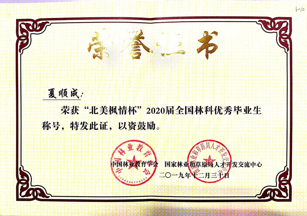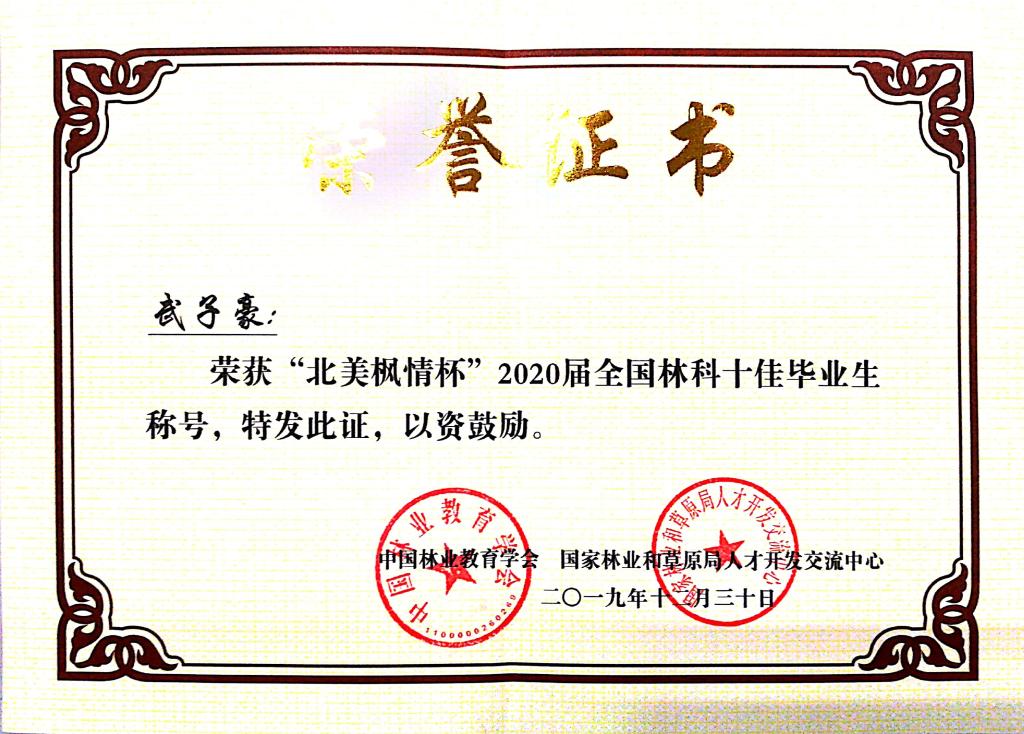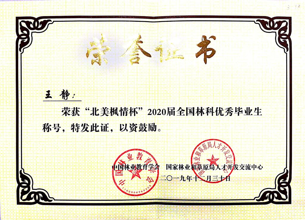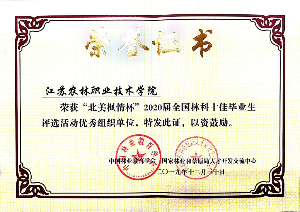 12月30日,由中国林业教育学会和国家林业局人才开发交流中心共同举办的“北美枫情杯”2020届全国林科十佳毕业生评选活动颁奖典礼在东北林业大学举行。我校荣获“北美枫情杯”2020届全国林科十佳毕业生评选活动优秀组织单位荣誉称号,风景园林色花堂