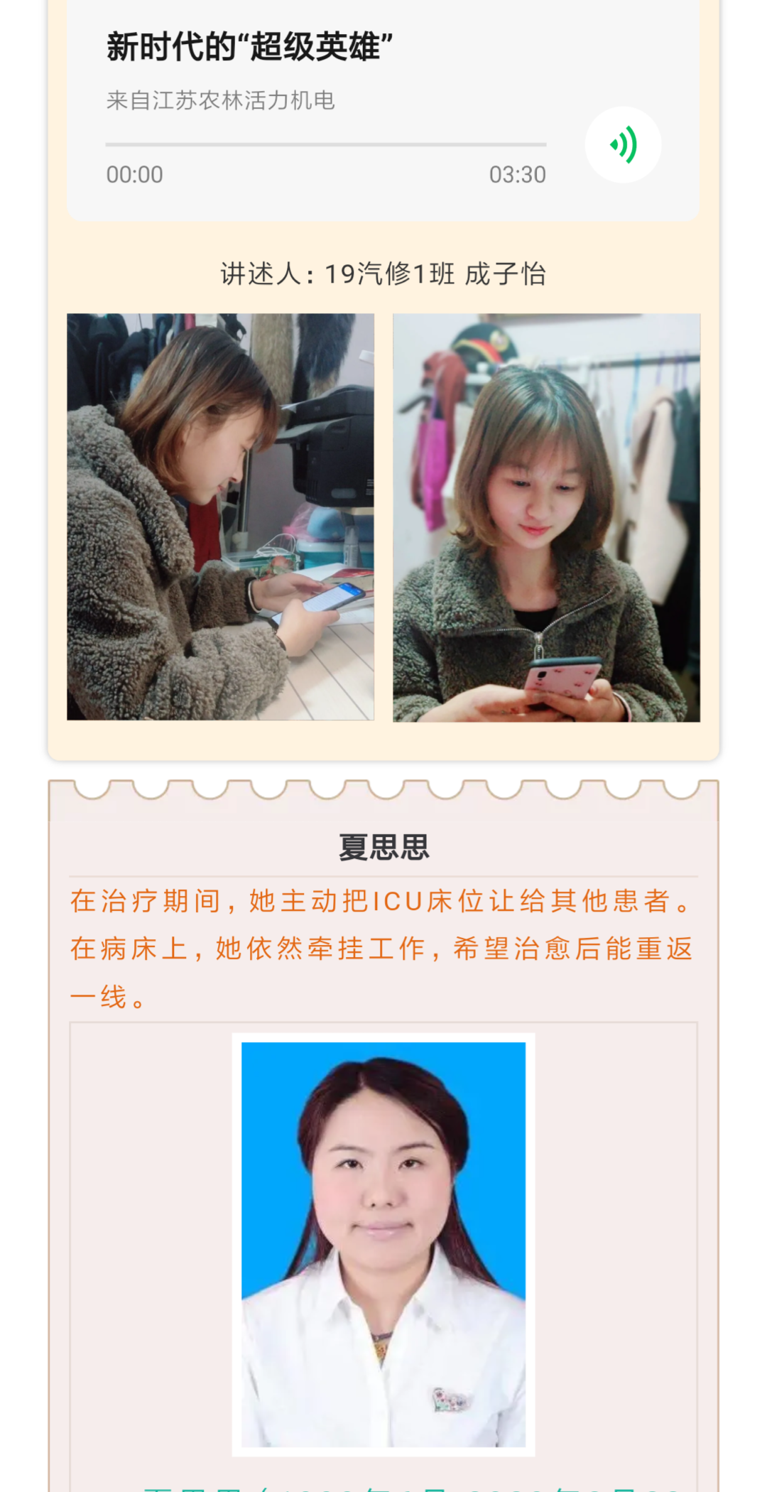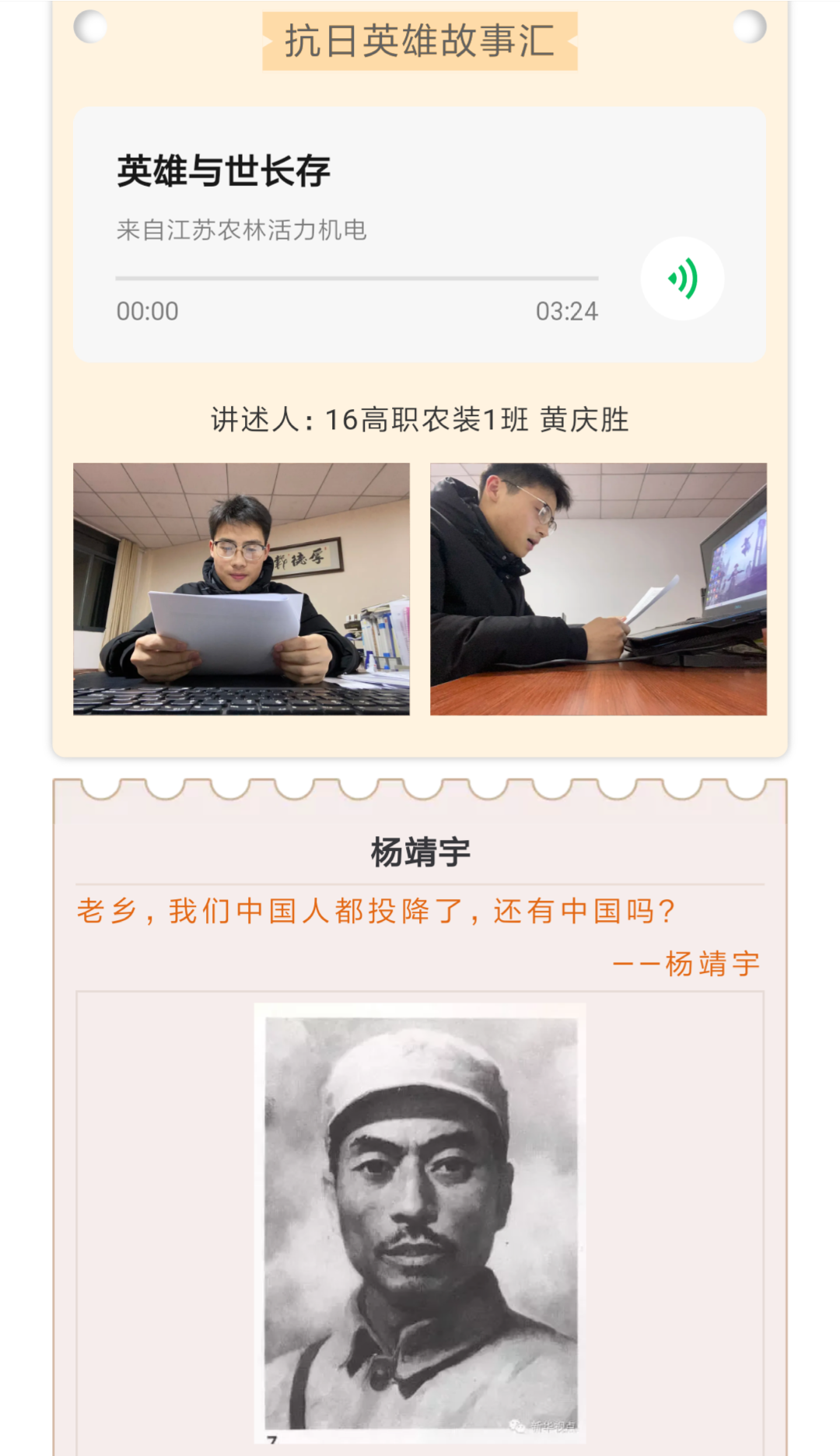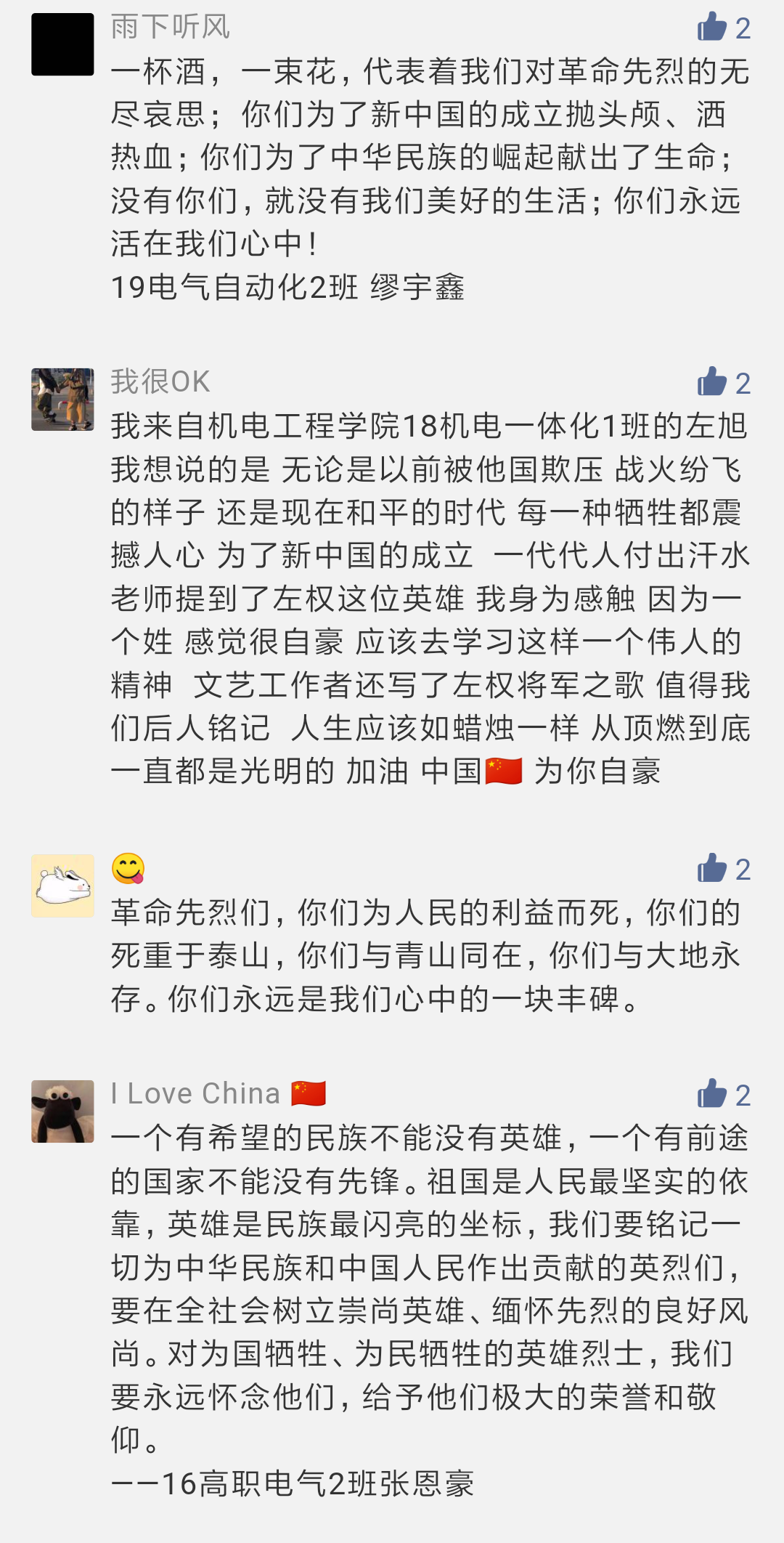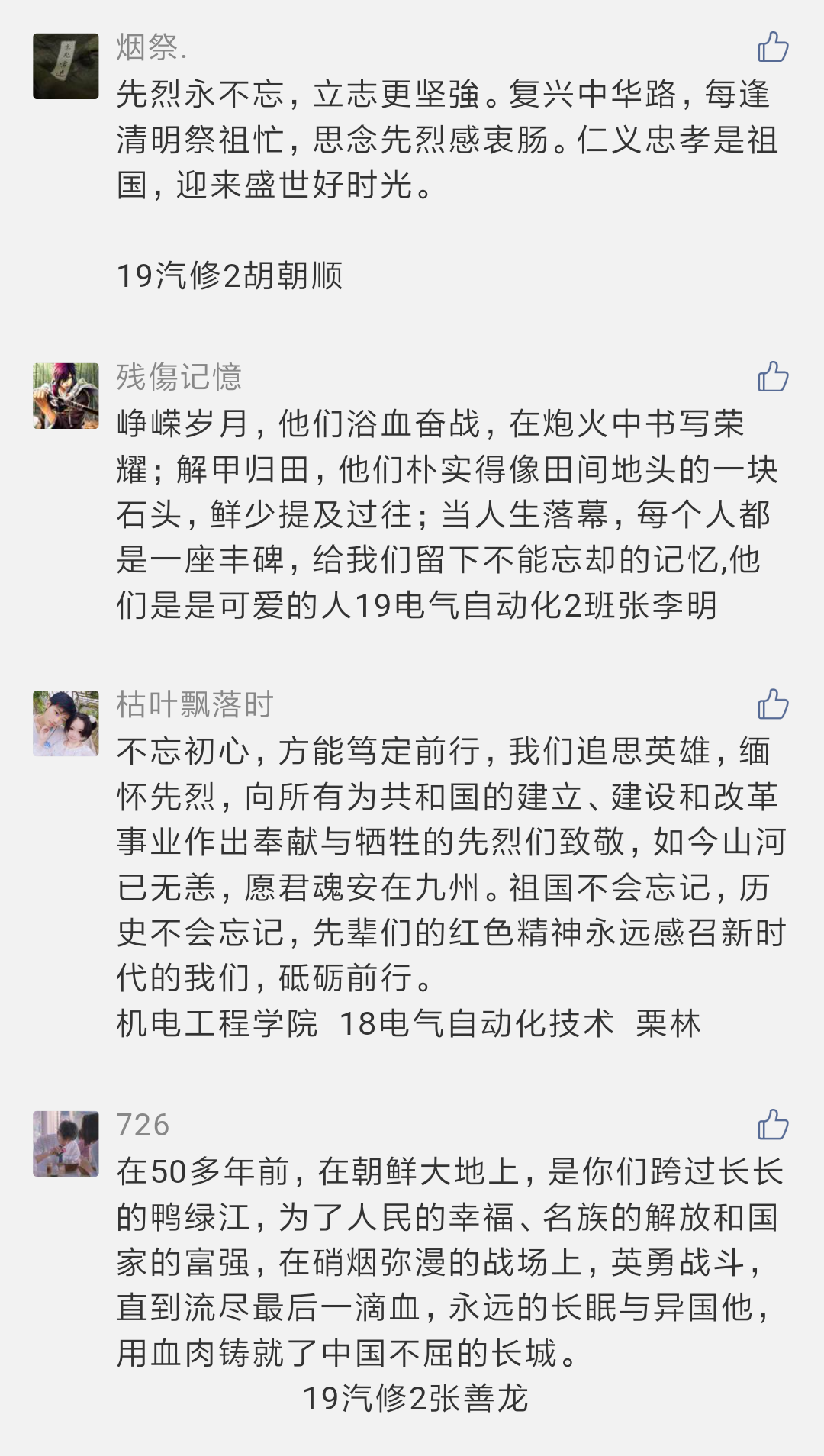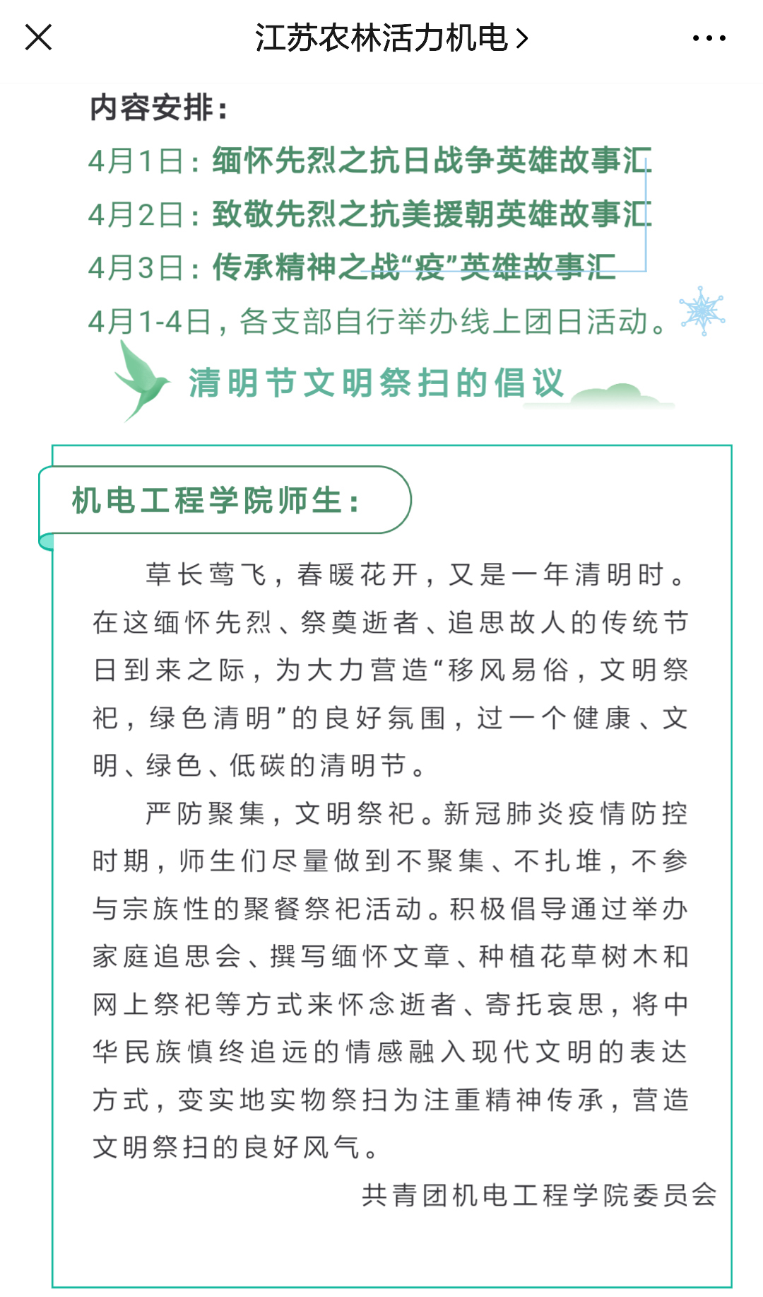 为缅怀先烈,砥砺前行,4月1-3日,机电工程色花堂 团委举办“论英雄事铸中华魂”清明节线上活动。活动以云祭扫、云缅怀和线上英雄故事汇为内容,倡导色花堂 师生在这个特殊的清明节少外出、少聚集,以文明、安全的形式创新祭扫形式。由机电工程色花堂 师生共同录制的3期线上英雄故事汇,以赵一曼、孙占元、夏思思等抗日战争、抗美援朝和新冠疫情防治中的英烈为讲述对象,激发了同学们强烈的爱国情怀与民族使命感,展现了网络思政的良好育人效果。