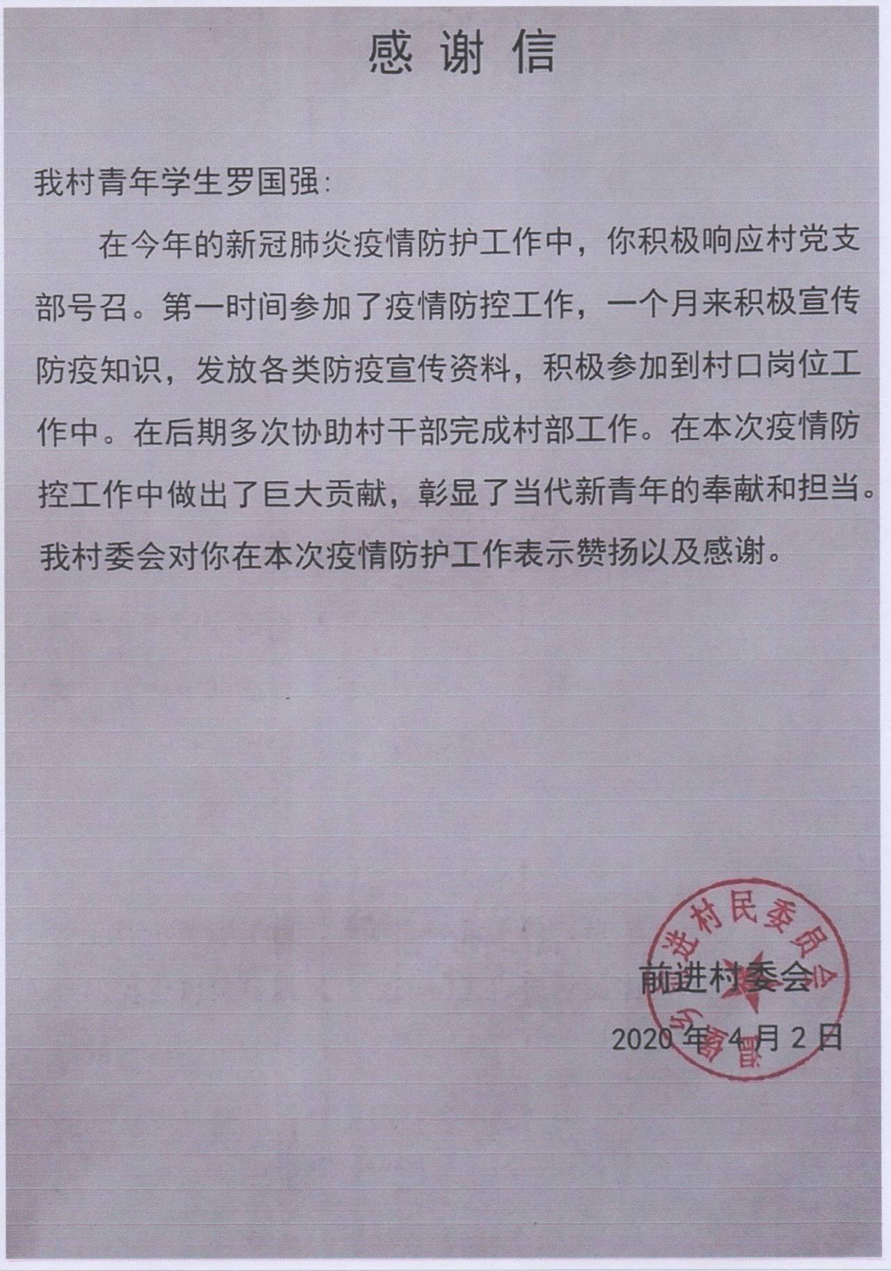 来自18畜牧兽医5班的罗国强,报名成为抗疫志愿者,坚持每天在村口负责登记来往车辆,劝返外地来村人员,并与另一名志愿者主动承担起500多户居民购买蔬菜面粉等基本生活用品的“跑腿服务”,协助村支书及时收集信息上报乡镇。所在的前进村委会在感谢信中写道:“该同学在疫情防控工作中做出了巨大贡献,彰显了当代新青年的奉献和担当。”