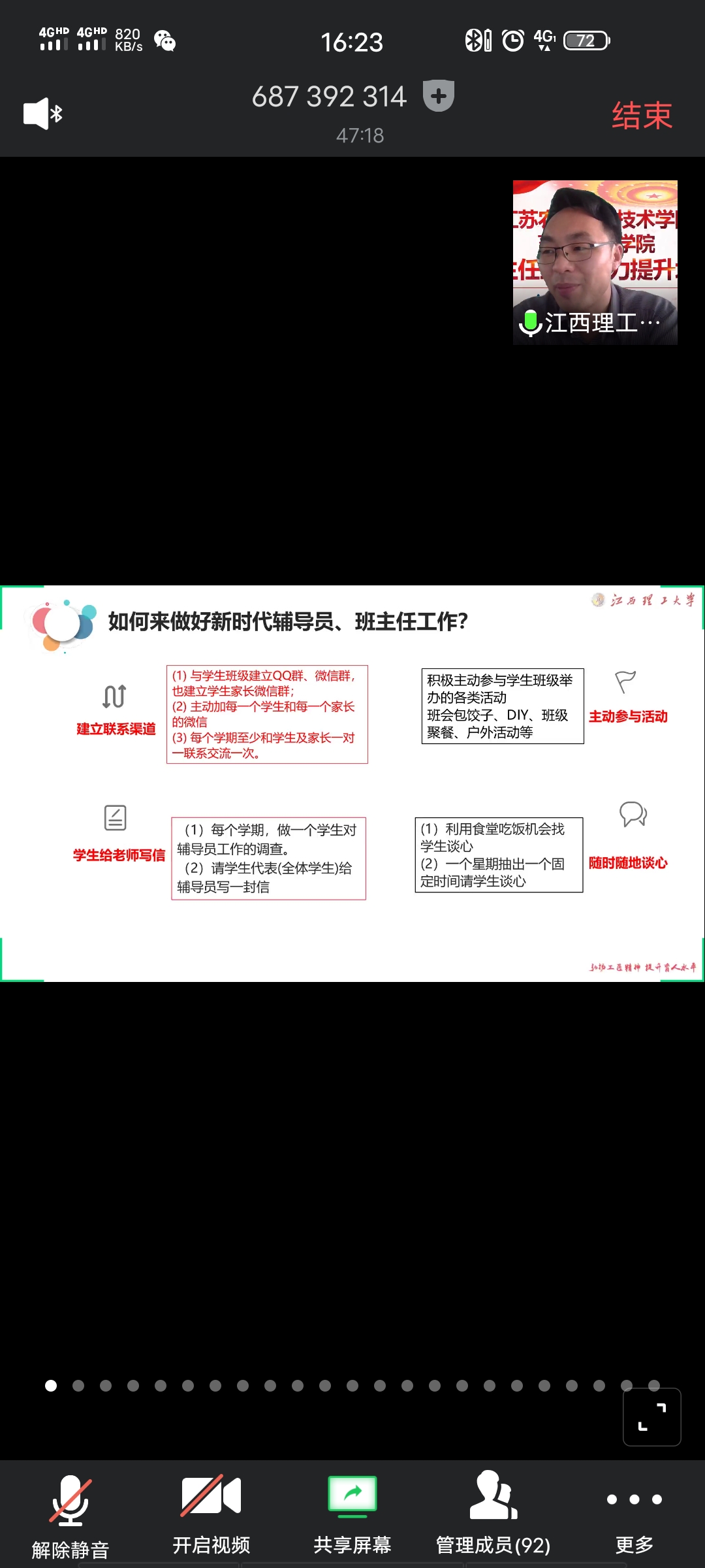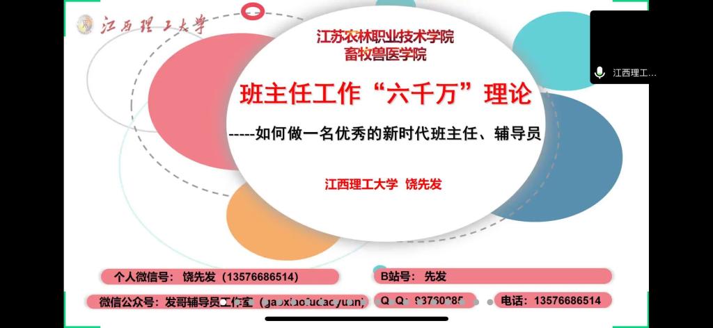 班主任能力提升系列培训活动第一期“云讲座”在腾讯课堂顺利举办。讲座邀请了教育部高校思想政治工作中青年骨干、全国共青团研究中心特聘副研究员、江西理工大学饶先发博士作题为《班主任工作的“六千万”理论——如何做一名优秀的新时代班主任》的培训。畜牧兽医色花堂