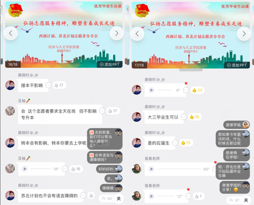 团委举办西部计划和苏北计划志愿者线上交流分享会。意向报名2020年西部计划和苏北计划的15名同学和所有的入党积极分子参与了活动。