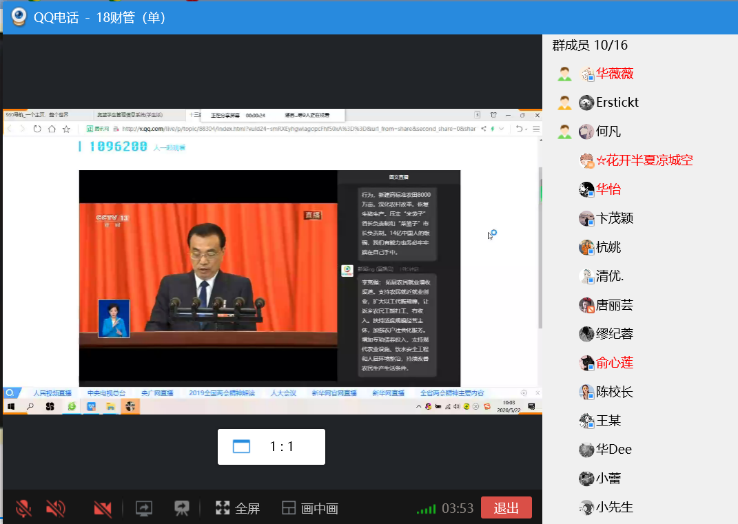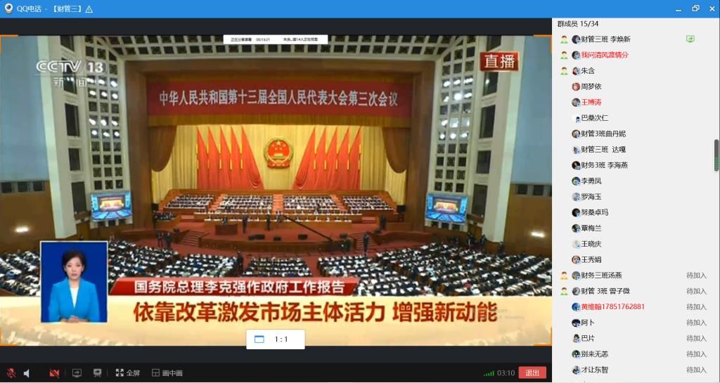 各团支部广大团员青年通过电视直播、网络直播和广播等多种途径收听、观看和密切关注“两会”,并通过QQ空间青年微话题讨论,QQ群等线上讨论方式,对“两会”进行了热议。团干部白金艳同学说:今年我看到了不同寻常的“两会”和万众一心的力量。通过政府工作报告和代表、委员的发言可以看得全面、清晰、及时了解国家的决策,对我们调整自己的学习方向和人生目标都具有重要作用。毕业生高启航同学表示:民生保障和就业创业是我最关注的问题,受到疫情影响,我感到很大的就业压力。收看了“两会”,对《政府工作报告》中提出的千方百计稳定和扩大就业感受很深,信心倍增。我相信困难只是暂时的,在国家的政策和学校的帮助下,一定能够实现人生价值。