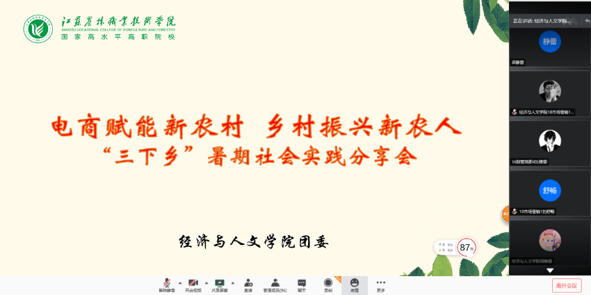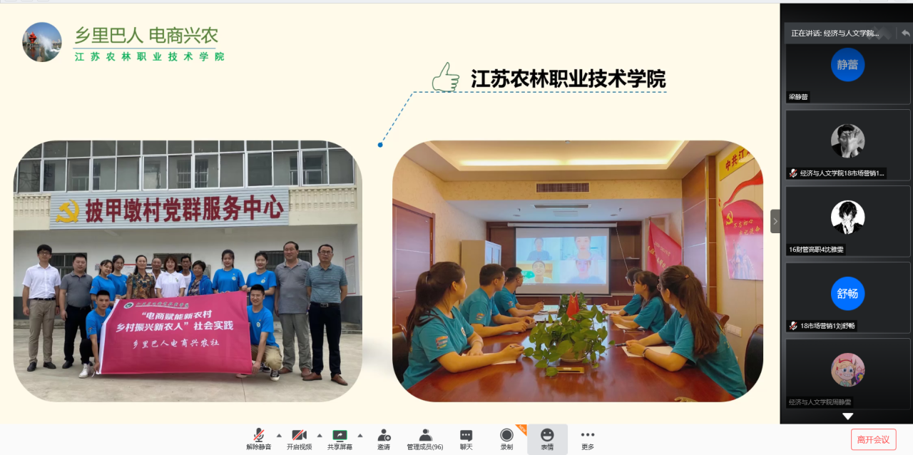 7月26-8月4日,“乡里巴人”社团赴灌云、句容两地,开展了为期十天的“电商赋能新农村,乡村振兴新农人”暑期社会实践活动。团队师生分享了团队从组建到实践的全过程,结合“互联网+”农业为特色产业作出实地调研收获和实践心得,展示了团队如何通过实地走访、座谈的方法,调研了灌云县小伊庄孙荡村等9个低收入村的特色农业和电子商务情况,并通过在线直播对当地菌菇等特色农产品进行试售。