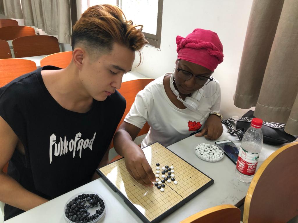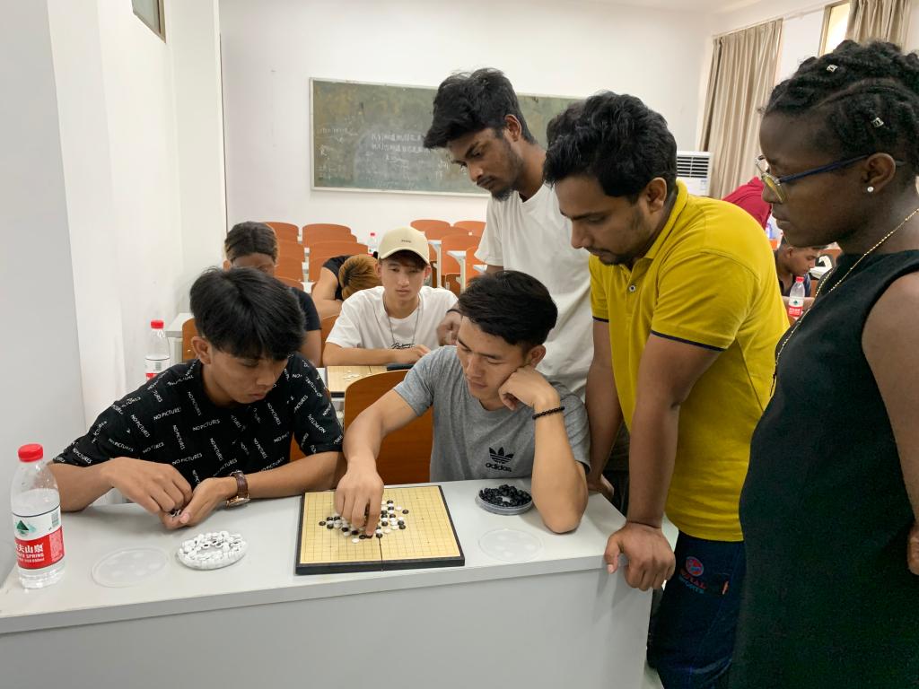 在文科楼205举办“棋乐无穷”趣味五子棋大赛,吸引了来自肯尼亚、老挝、孟加拉等国40多名留学生参加。