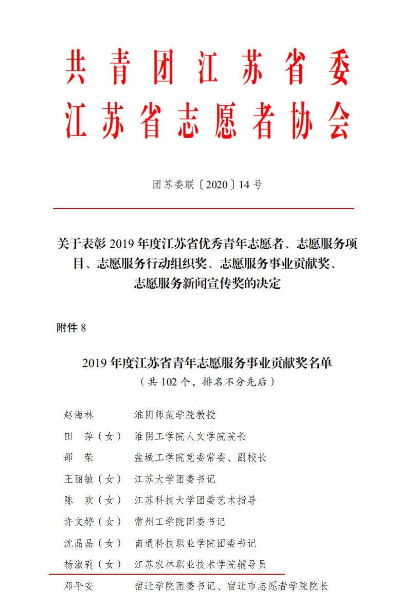 近日,江苏团省委公布2019年度全省青年志愿者行动评选表彰名单,我院杨淑莉老师获评“2019年度江苏省青年志愿服务事业贡献奖”。