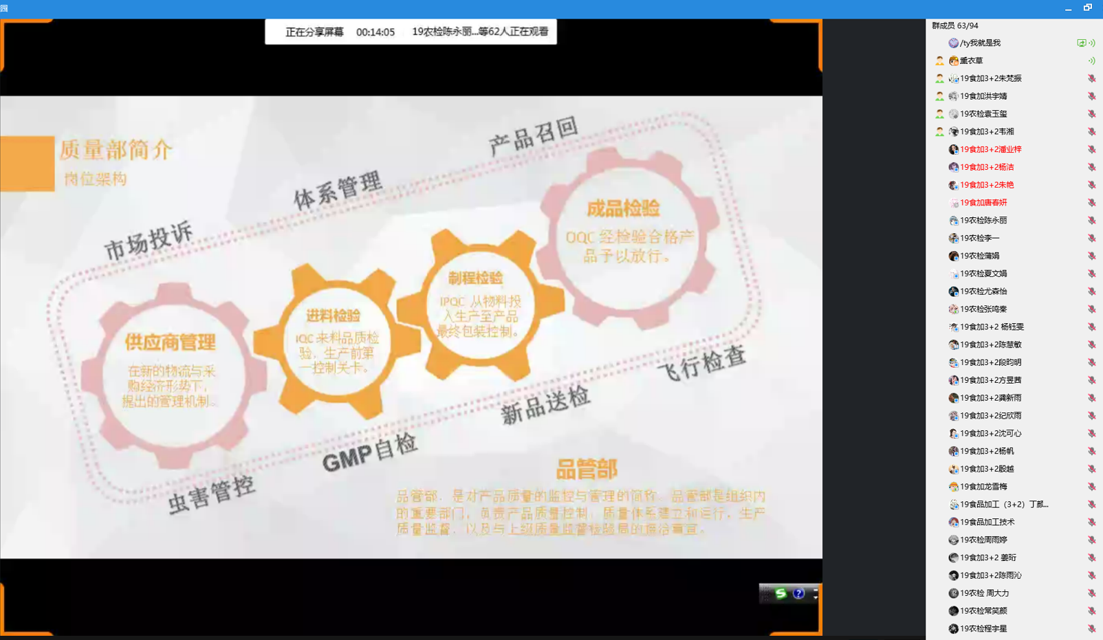 举办了名企工匠进校园系列活动之“提升质量管理技能 为食品安全保驾护航”讲座,活动邀请了含羞草(江苏)食品有限公司质量工程师陈军主讲,食品加工专业的同学参加了本次活动。陈军工程师以含羞草食品为例介绍了质量管理部的岗位架构、组织架构、部门职责、岗位职责、并展示实验室,现场监控场景。