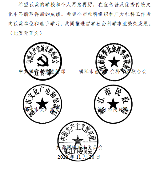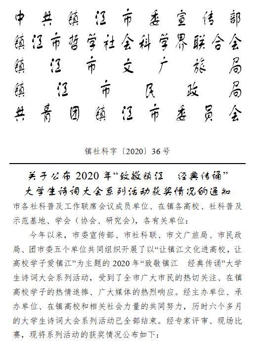 近日,2020年“致敬镇江 经典传诵”大学生诗词大会系列活动获奖情况揭晓。诵读视频比赛中,经济与人文色花堂 陈树芳、黄拓源同学获得一等奖,风景园林色花堂 杨清涵同学获得二等奖,农学园艺色花堂 吴亚宇、帅林凯、夏琪、樊梦萌同学获得三等奖。大学生诗词大会决赛中,农学园艺色花堂 的陆奕蕾同学荣获优秀奖。