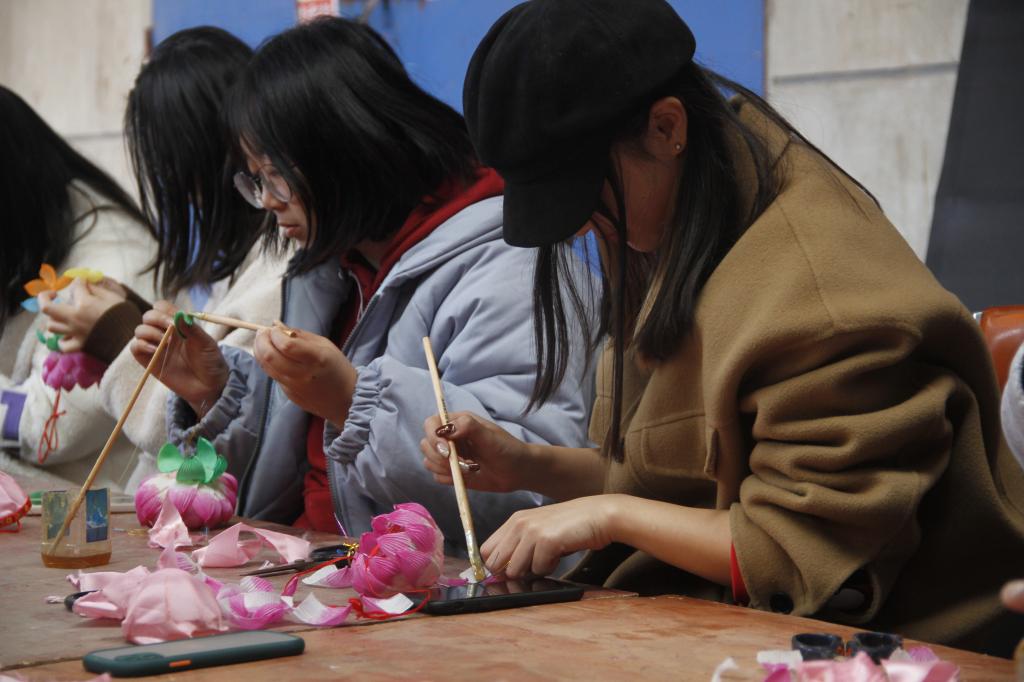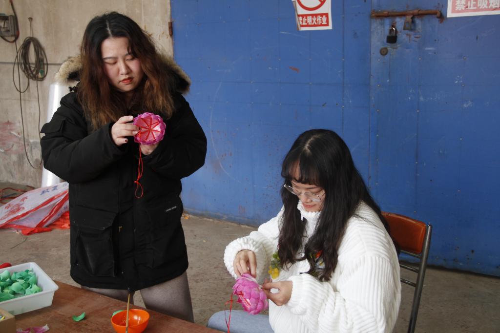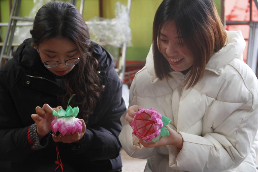 同学们首先跟随传承人陈柏华先生参观了彩灯陈列室,近距离参观了他制作的在国内外获得各项荣誉的花灯,了解了非物质文化遗产句容陈氏秦淮花灯的发展历程。陈柏华先生向同学们讲解了花灯的制作材料、工艺、方法和艺术,同学们在陈先生的指导下开始自己动起手来,用分发的素材制作简单的荷花灯,扎框子、扎花瓣、贴花瓣、做花头,造型精美的荷花灯就制作完成了。同学们体验了亲手制作花灯的乐趣,也感受到了花灯艺人的“匠人精神”。