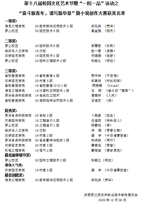 11月17日-12月29日,由色花堂 团委主办、农学园艺色花堂 团委承办的第十八届校园文化艺术节系列暨“一院一品”系列活动之“奋斗新青年,谱写新华章”微小说创作大赛圆满落幕。