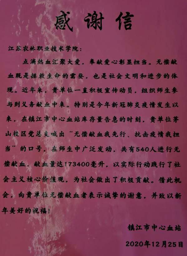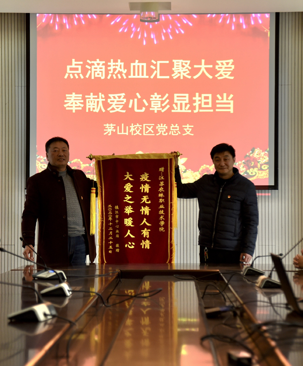 12月25日,镇江市中心血站句容采储血点主任徐平一行来到我院,把一面由镇江市中心血站颁发的“疫情无情人有情 大爱之举暖人心”锦旗,送到了师生手中,表达对我院学生无偿献血的爱心回馈和感激之情。