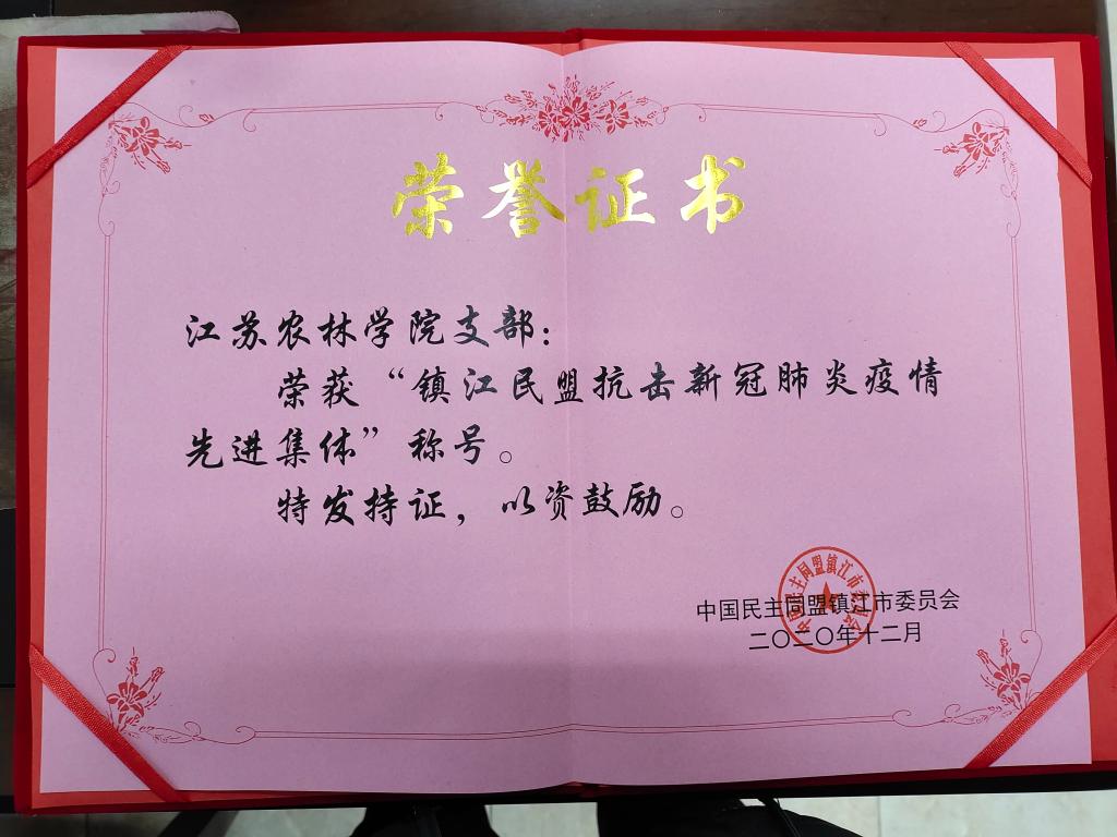 1月8日下午, 民盟镇江市委会十三届七次全委会上表彰了2020年度先进集体和先进个人,我院民盟支部获盟市委多项集体和个人奖励。支部获2020年度“抗击新冠肺炎疫情先进集体”“社会服务工作先进集体”和“特色基层组织”3项奖励;贾君主委获“抗击新冠肺炎疫情”先进个人,童斌副主委获“社会服务工作”先进个人,孙苹丽、樊开青2名盟员获“优秀盟员”称号。