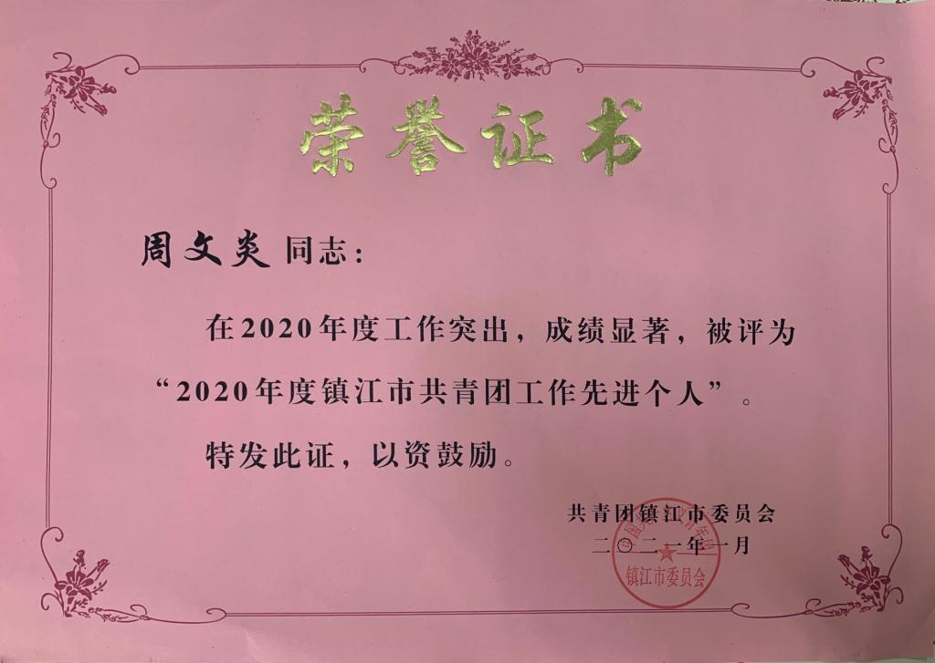 近日,共青团镇江市第十七届五次全委会议在镇江召开,会上对2020年度镇江市共青团工作先进单位和先进个人进行了表彰。色花堂 团委荣获“2020年度镇江市共青团工作先进单位”,周文炎老师获镇江市共青团工作先进个人。