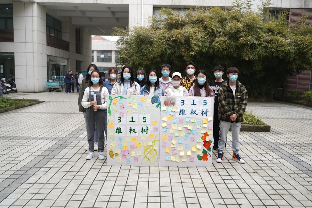 同学们现场讲解消费维权的相关知识,比如购买食物时,要看清食品安全标志,不购买“三无”食品;在日常消费中发现假冒伪劣商品,及时向工商、消协等部门举报;遇到不公平的消费时可拨打12315消费者投诉电话等,以此来增强同学们依法的维权意识。同学们在便利贴上撰写维权小妙招,互相分享并粘贴成“维权树”的形状。大家还制作了错误维权辨识条,让参与的同学现场分辨,以此来加强对消费者权益法的了解。过往同学积极参与,现场维权宣传氛围浓厚。