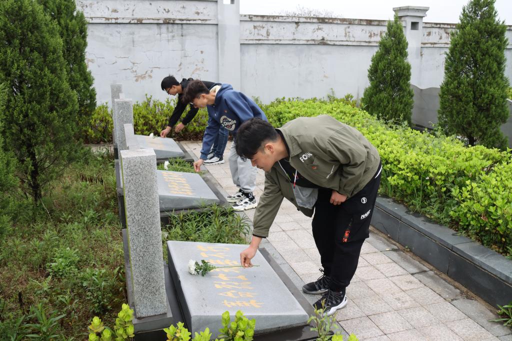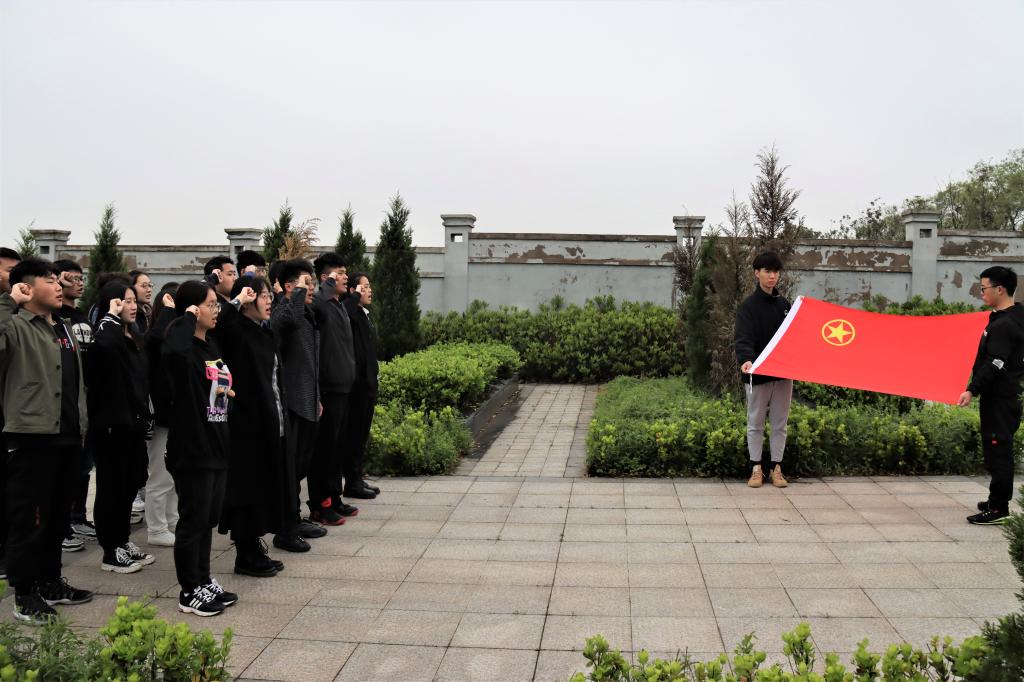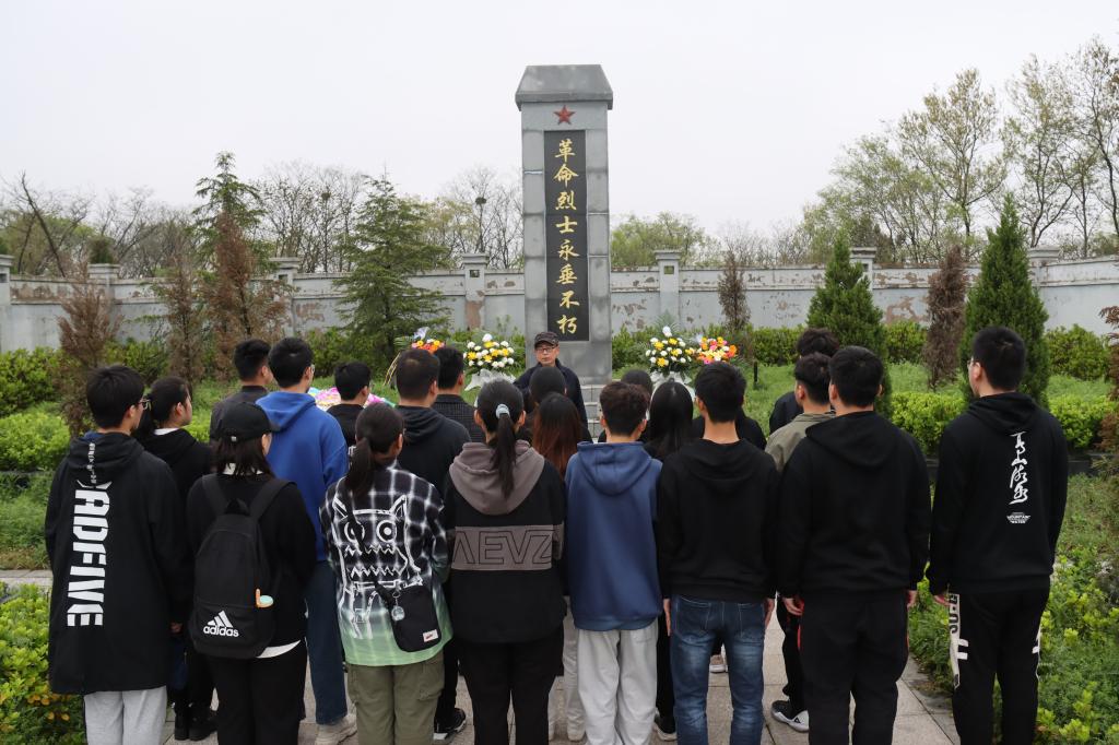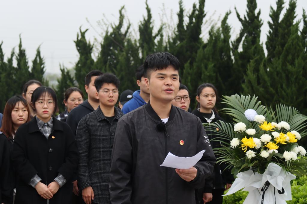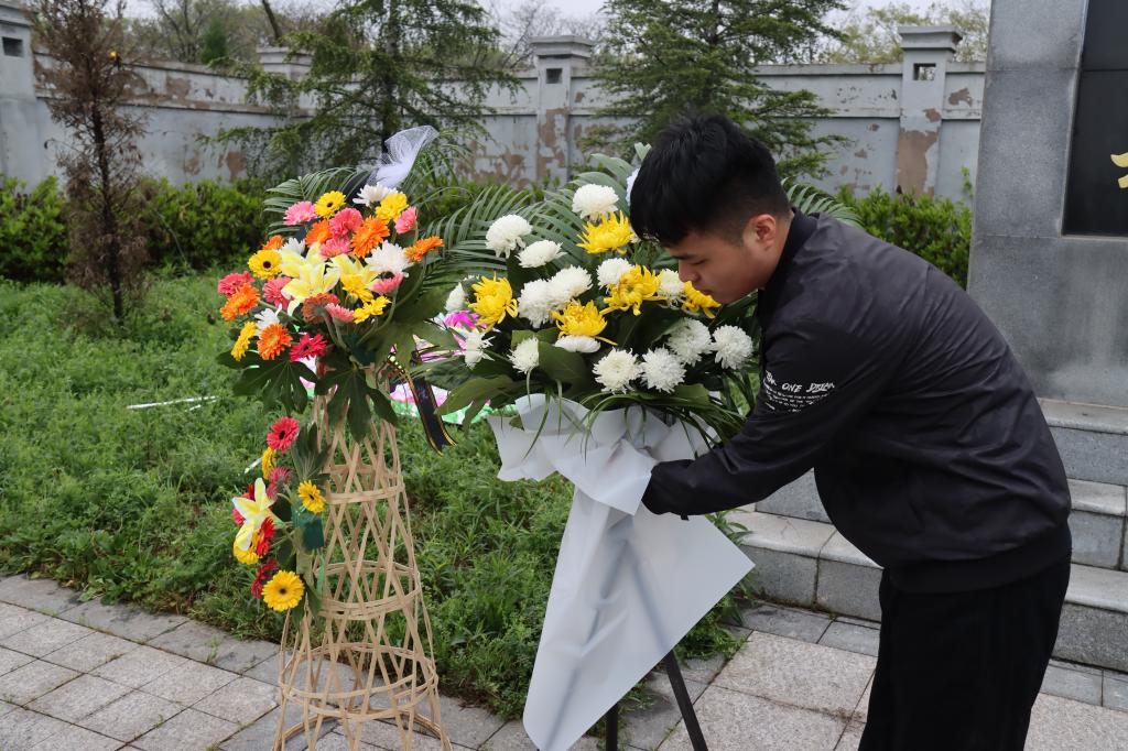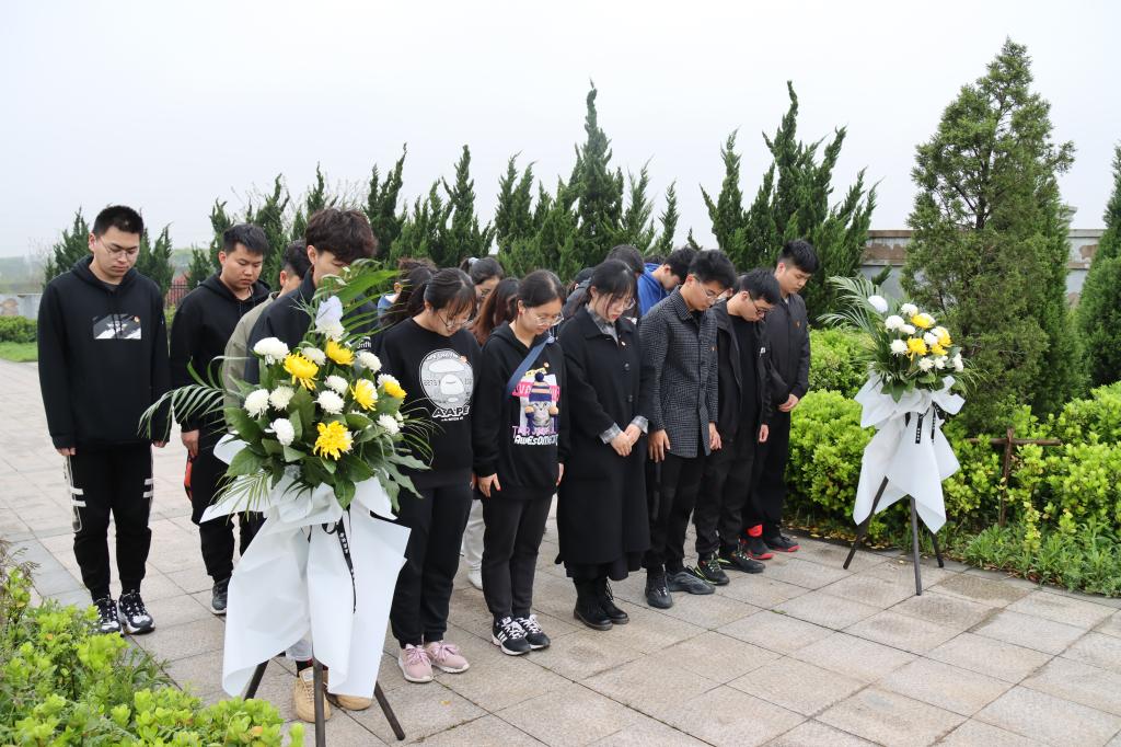 伴着沉痛的哀乐,团员代表向烈士们敬献花篮,并行三鞠躬礼。熟知当地历史的任保根老先生为同学们介绍了多位英烈的革命故事,希望同学们牢记历史,珍惜当下幸福生活,挑起新时代建设的重担。随后,团员代表刘磊声情并茂的朗诵了扫墓词,字字句句都充满了对革命先辈们的无限缅怀,同学们一同重温入团誓词,坚定入团初心。活动最后,同学们瞻仰革命烈士墓,依次敬献鲜花,表达了对烈士的深深敬意与无限哀思。