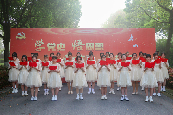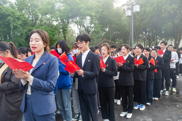 活动现场老团员还进行了重温入团誓词。活动最后,千名青年大学生手摇小国旗,齐唱《歌唱祖国》,歌如海、声如潮、情如涛,一首激情高昂的千人大合唱给本次“国旗下的学党史”画上了圆满的句号。