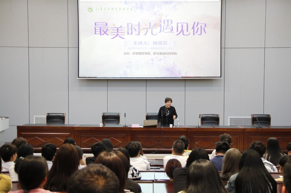 5月18日,农学园艺色花堂 联合茶与食品科技色花堂 在研发楼报告厅举办“最美时光遇见你”大学生恋爱心理讲座。讲座邀请到了南京航空航天大学心理健康教育中心主任杨雪花老师担任主讲嘉宾。