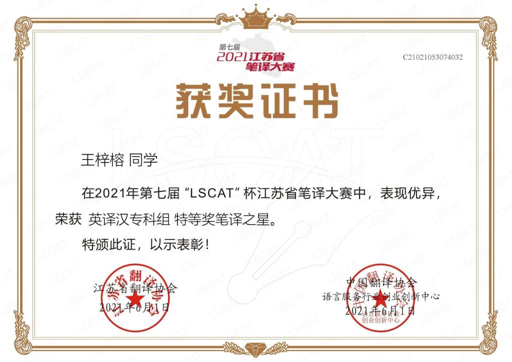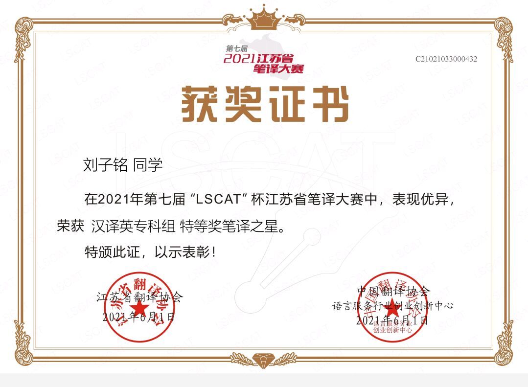 “LSCAT”杯江苏省笔译大赛由中国翻译协会语言服务能力培训与评估中心(LSCAT)、江苏省翻译协会、江苏省高校外语教学与研究会联合举办,旨在培养高素质语言服务人才,满足江苏省日益扩大的对外交流需求,推动高校英语教学整体发展,促进专业学科建设和语言服务行业的繁荣与发展。竞赛分别设立“英译汉”和“汉译英”两个翻译方向,一等奖占参赛总数的1%,一等奖获奖者将直接入选中国翻译协会LSCAT 人才库。