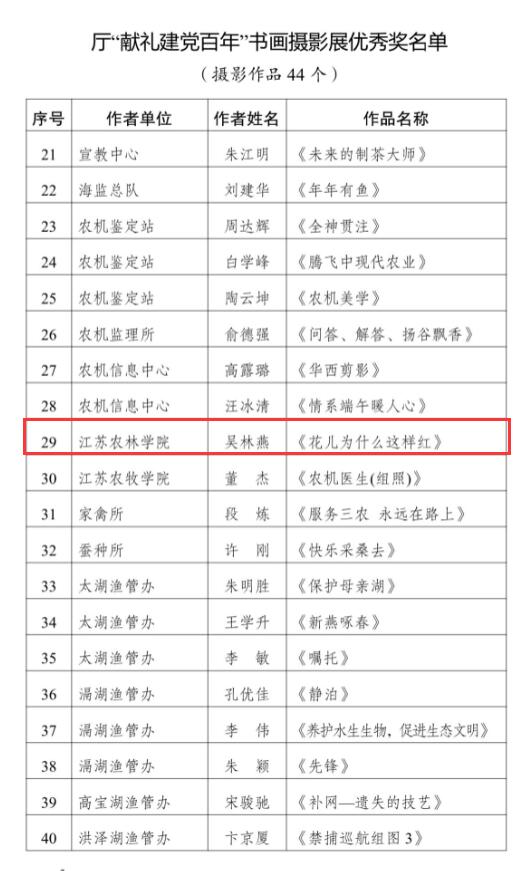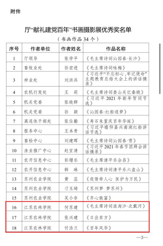 为庆祝中国共产党成立100周年,厅直属工会联合会举办了以“献礼建党百年”为主题的厅机关干部职工书画摄影展。我院工会积极组织教职工参与,并推选优秀作品参赛,经过评审组评选,我院何苏建、张兴建、傅浩兰、邹阳四位老师获书画展优秀奖,吴林燕老师获摄影展优秀奖。