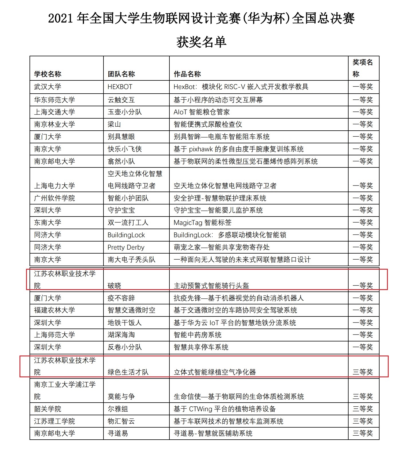 获奖作品分别是全国大学生物联网设计竞赛(华为杯):《主动预警式智能骑行头盔》(参赛学生:黄斌、钱程,指导教师:蒋其友、李娜)获得全国一等奖,华东赛区一等奖,《立体式智能绿植空气净化器》(参赛学生:杨环、陆宇龙、王洪丽,指导教师:仲瑶、潘蓉)获得全国三等奖,华东赛区一等奖。全国大学生计算机设计大赛:《室内立体草坪种植系统》(参赛学生:王梓旭、陈超、朱法铜,指导教师:蒋其友、崔明)获得全国三等奖,江苏赛区三等奖,《基于光谱技术的便携无损检测装置》(参赛学生:沈家礼、梁文杰、郝一腾,指导教师:蒋其友、薛小松)获得全国三等奖,江苏赛区二等奖。