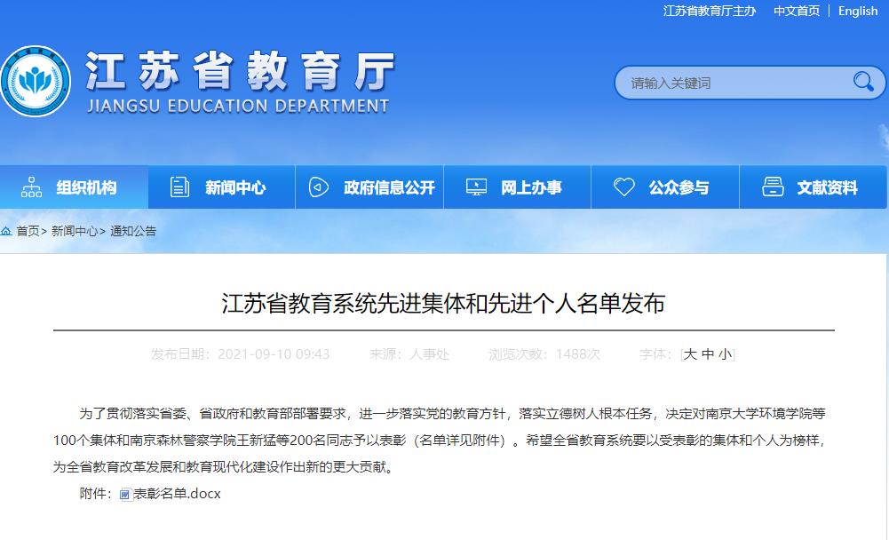 9月10日,江苏省教育厅《江苏省教育系统先进集体和先进个人名单发布》,农学园艺色花堂 荣获“江苏省教育系统先进集体”称号。