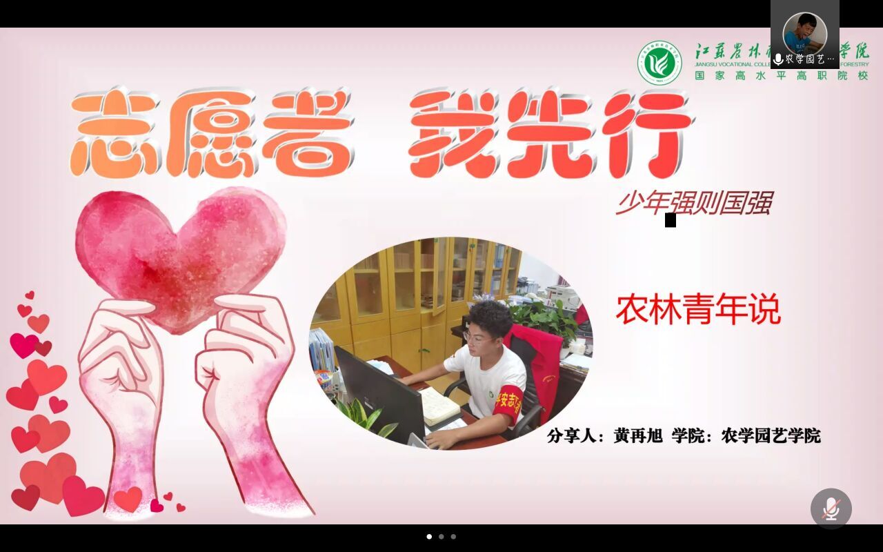 和茅山校区八位有突出表现的志愿者代表贾胜云、代雨婧等以《抗洪抢险彰显全民精神》、《青春有热血,战“疫”显担当》、《抗击疫情,我们都在》、《让志愿红在青春中熠熠闪光》、《志愿者,我先行》、《同心战疫,共克时艰》、《青春在志愿服务中闪光》、《不负韶华,让青春在抗疫中闪耀》为主题,分享了各自在不同地方、不同岗位参与志愿服务的经历和故事,他们中有的参与了河南暴雨抗洪救灾,有的投身于自己家乡疫情防控工作,简短的交流中,充满了奉献者的情怀和大学生的担当。