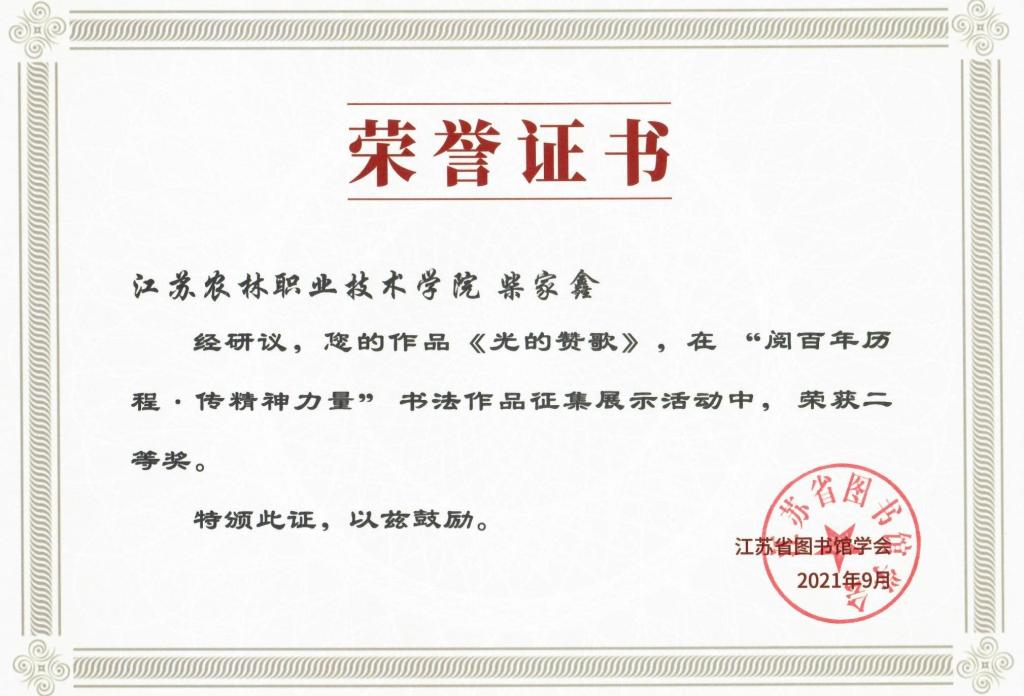 近日,由江苏省图书馆学会阅读推广委员会举办的“阅百年历程·传精神力量”书法比赛落下帷幕。本次比赛围绕党的百年历史和习近平新时代中国特色社会主义思想展开创作,共征集作品498部。经专家评审会初审、复审、研议、确认,最终评选出硬笔书法单项奖31个,软笔书法单项奖39个,网络人气奖31个,优秀组织奖16个。我校图书馆选送的作品共取得1个一等奖、1个二等奖和5个三等奖的优异成绩。