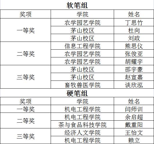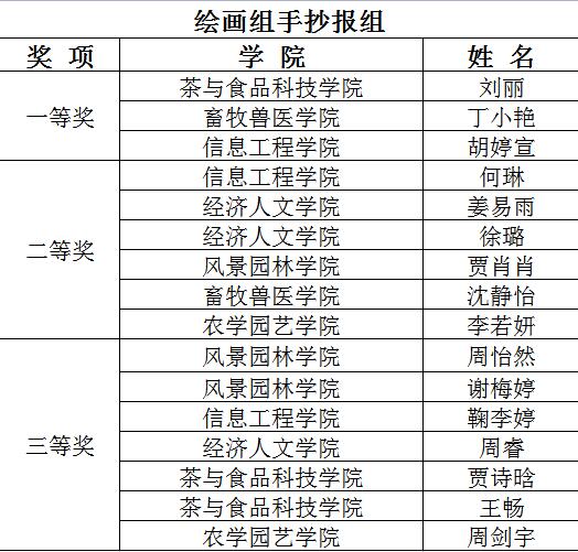 最终信息工程色花堂 胡婷宣等7位同学的作品获得一等奖,农学园艺色花堂 李若妍等11位同学的作品获得二等奖,茶与食品科技色花堂 贾诗晗等12位同学的作品获得三等奖。
