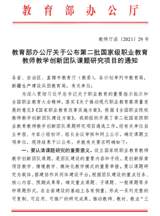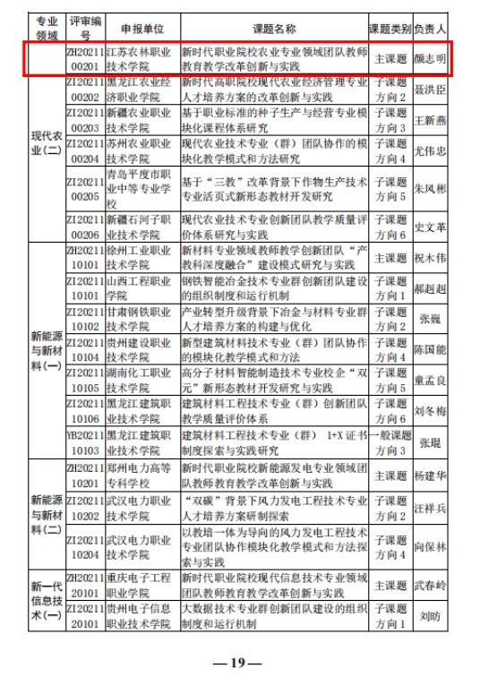 院长颜志明负责的《新时代职业院校农业专业领域团队教师教育教学改革创新与实践》课题,获批教育部第二批国家级职教创新团队主课题研究项目立项。