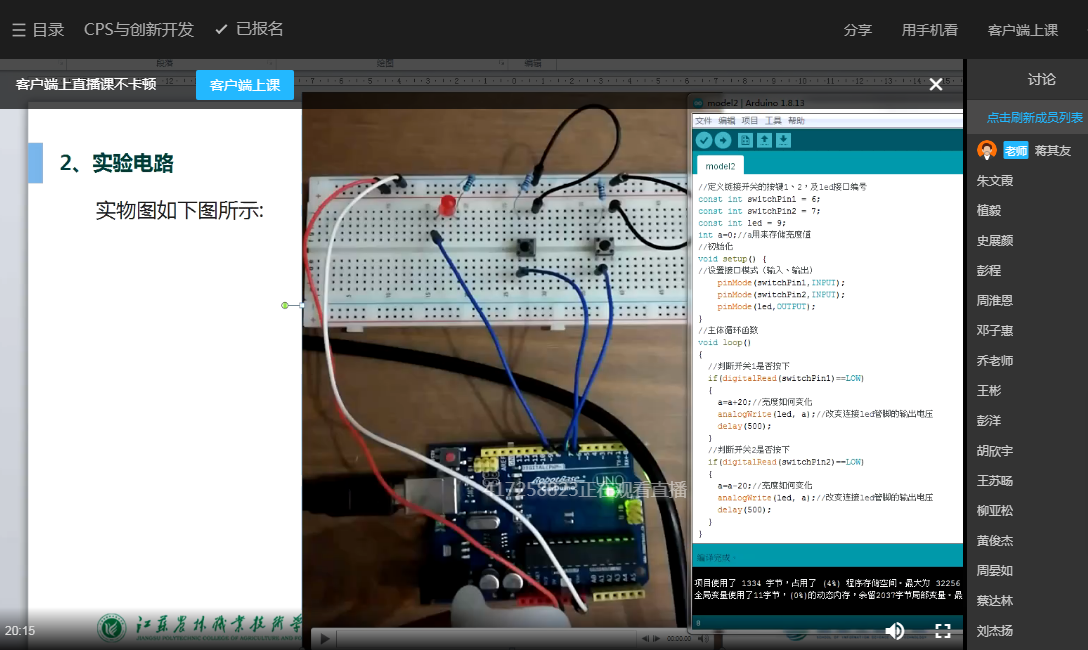 蒋其友老师在讲授《CPS与创新开发》课程时,强化实验过程演示,学生在老师的引导下在宿舍里完成实验装置的安装和测试,促进了学生参与实践教学的积极性,同时老师提出问题让同学们回答,有很多同学十分积极,常常主动连麦回答。