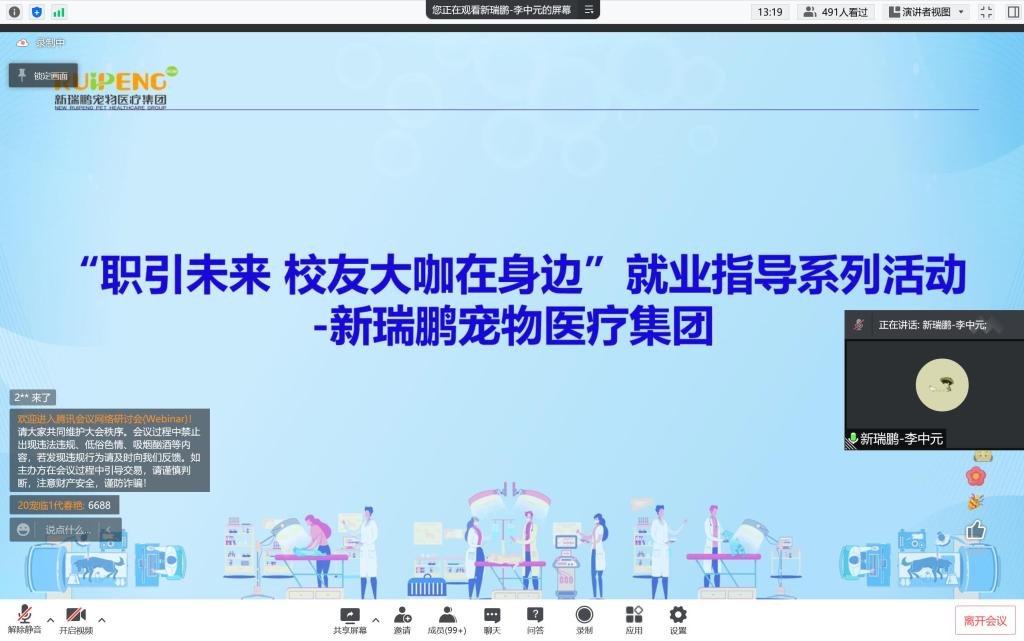 讲座邀请了在新瑞鹏宠物医疗集团、大北农集团就职的杰出校友—李中元院长、陆文场长,结合他们自身的经验体会及感悟,给毕业生们进行了职业发展前景的讲解,以及职业生涯规划的指导。大北农集团华东平台总经理也做了补充发言,重点进行了就业形势分析。讲座互动环节,同学们就自身就业中存在的疑惑和问题积极提问,李中元、陆文耐心且专业的给同学们进行了解答。