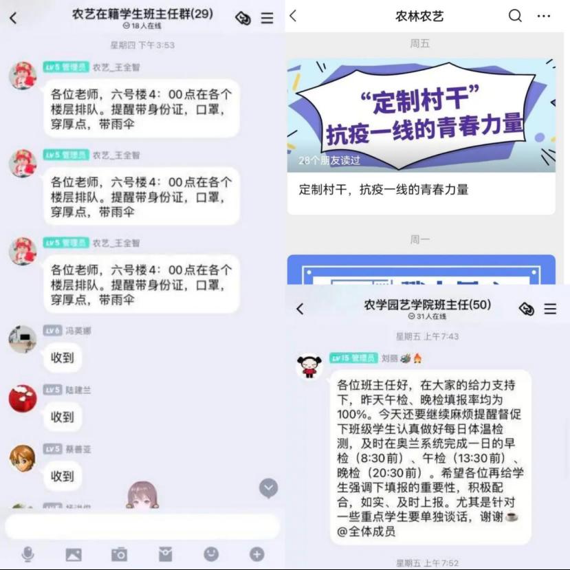 开展各项工作。学生公寓封闭管理期间,先锋队成员们每人包抓两层楼,负责楼层所有学生的送餐以及宿舍查寝。“敲门行动组”负责在每次核酸开展前,敲开每一个寝室门,提醒大家戴上口罩,有序排队参加核酸检测。“星”核小分队负责每日健康码、行程码的收集与核查,确保摸排工作全覆盖、不漏一人。