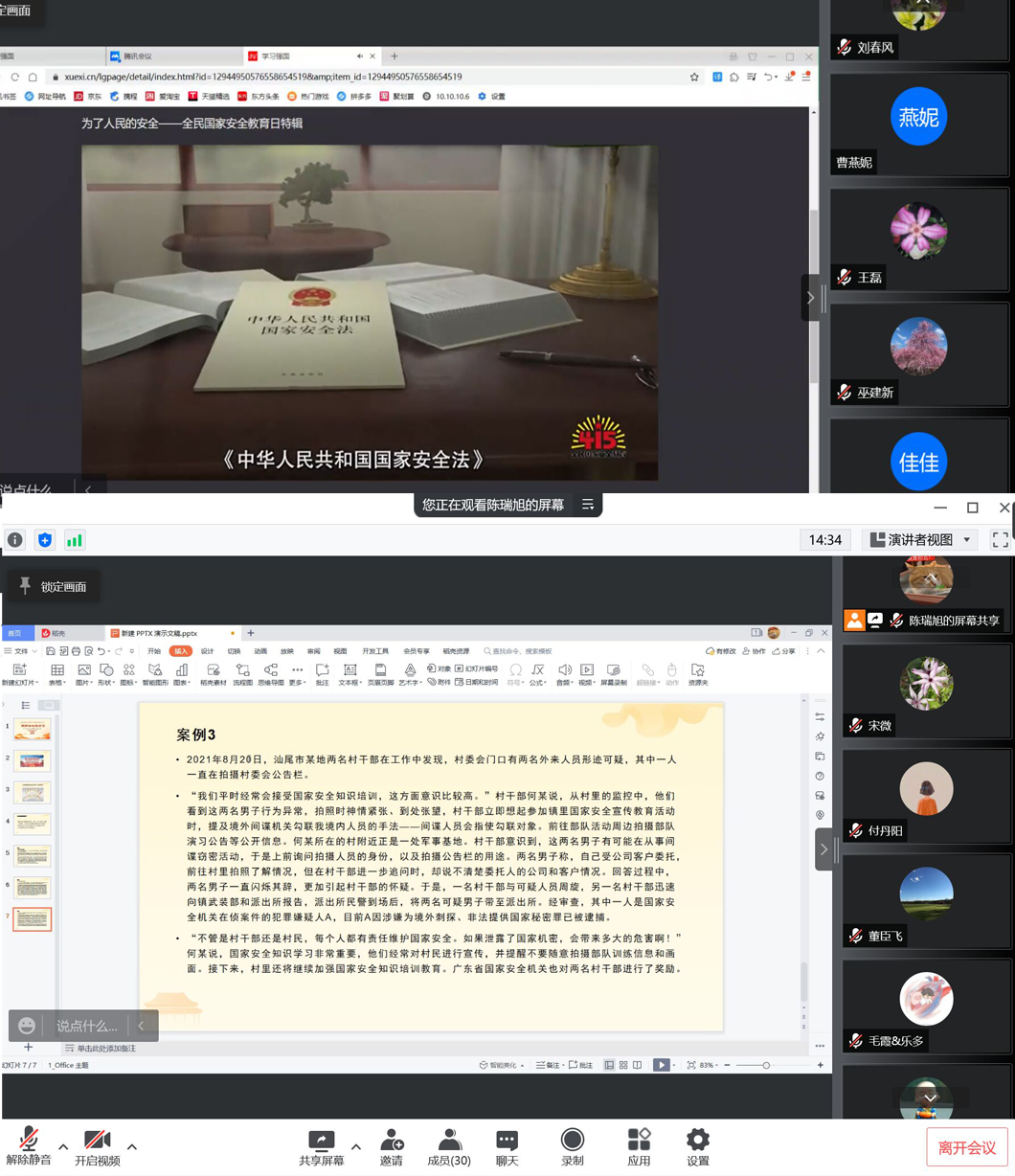 会后,各支部又通过不同的线上活动形式,组织教职工深入学习国家安全普法教育,切实提高教师们的国家安全意识,凝聚起大家共同维护国家安全的强大合力。