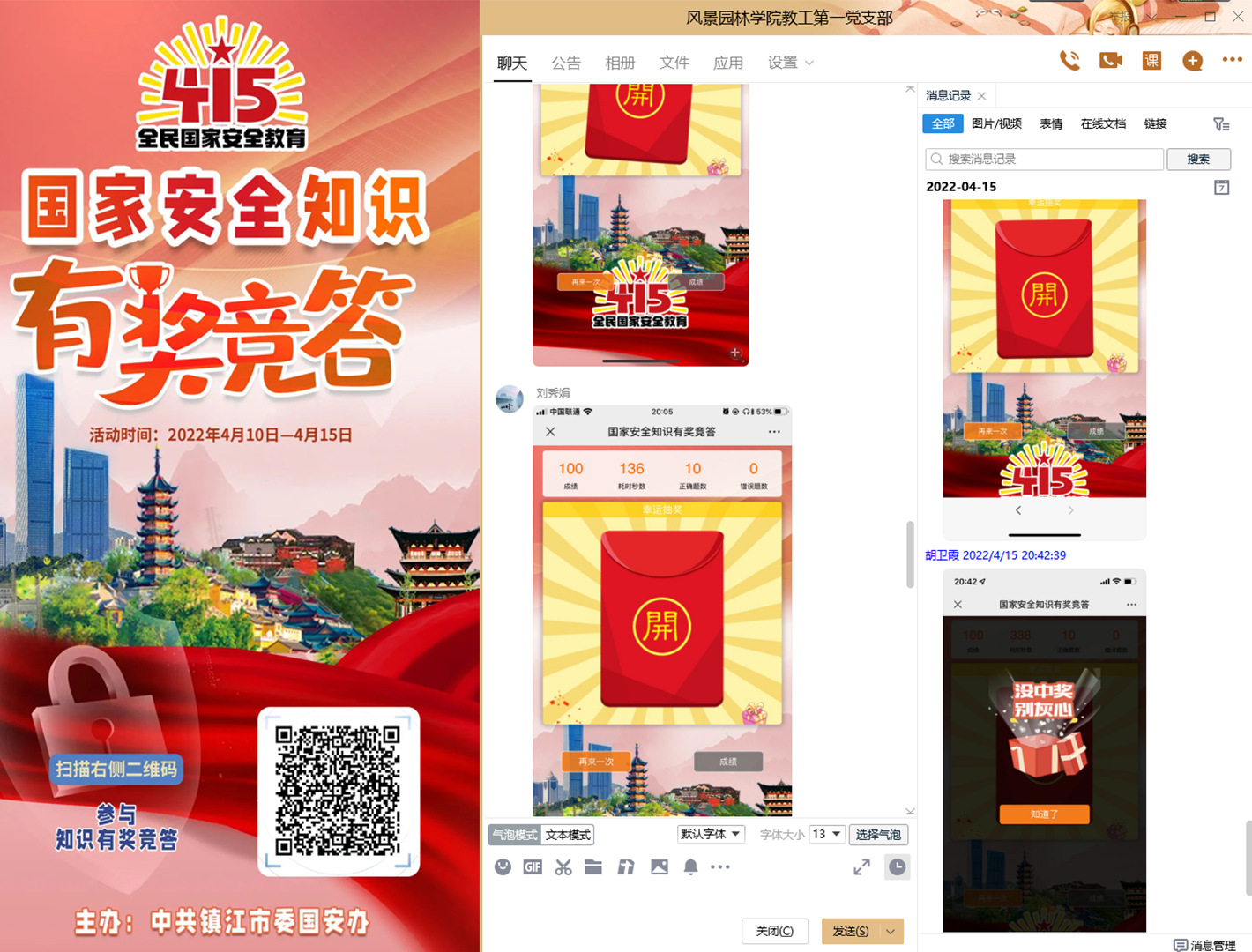 教工第一党支部积极参与了镇江市委国安办组织的线上有奖竞答活动,通过答题达到了以试促学的目的,不仅提高了教职工对国家安全知识的知晓率,更进一步增强了维护国家安全的责任意识。
