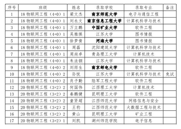首届本科生18物联网工程(4+0)、20物联网工程(专转本)17名同学被省内外高校录取为硕士研究生,复试成功率100%。其中孙悦同学推免至江苏大学,梁文杰、万立鹏、刘雨生、徐梦倩、刘永文五位同学获得双一流院校研究生入学资格。