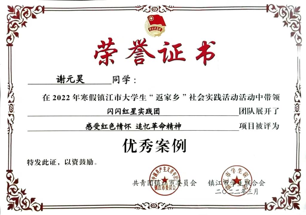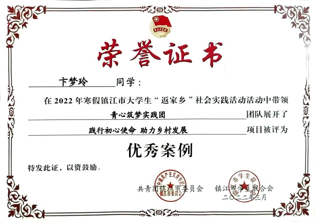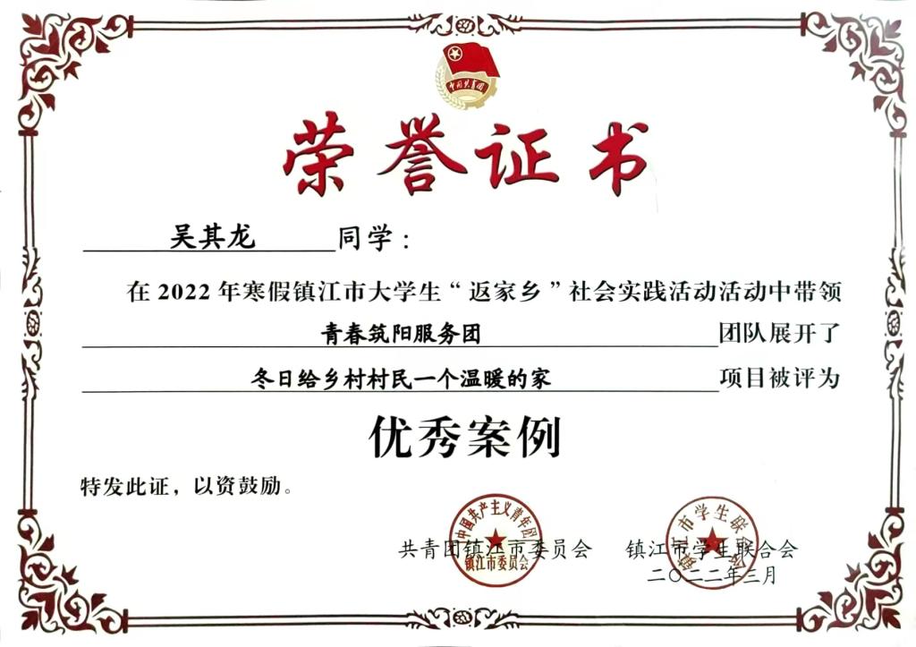 近日,共青团镇江市委员会、镇江市学生联合会公布了2022年寒假镇江市大学生“返家乡”社会实践活动优秀案例名单,我院青心筑梦实践团开展的“践行初心使命 助力乡村发展”实践、闪闪红星实践团开展的“感受红色情怀追忆革命精神”实践、青春筑阳服务团开展的“冬日给乡村村民一个温暖的家”实践、“青春行 家乡游 振兴路”实践团队开展的“青春担当 强国有我 以奋斗青春助力乡村振兴”实践等4项目获评2022年寒假镇江市大学生“返家乡”社会实践活动优秀案例。