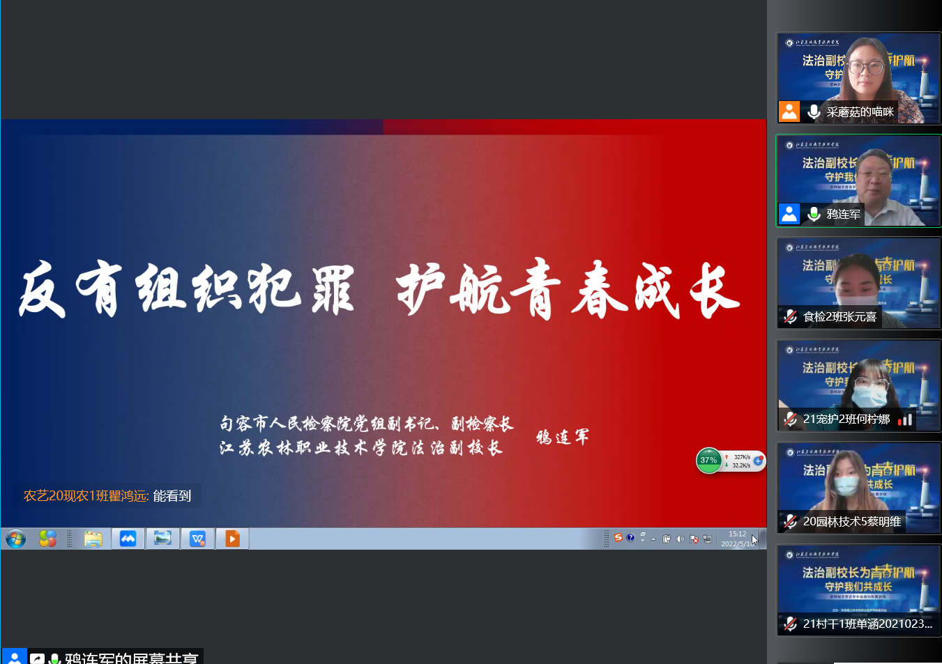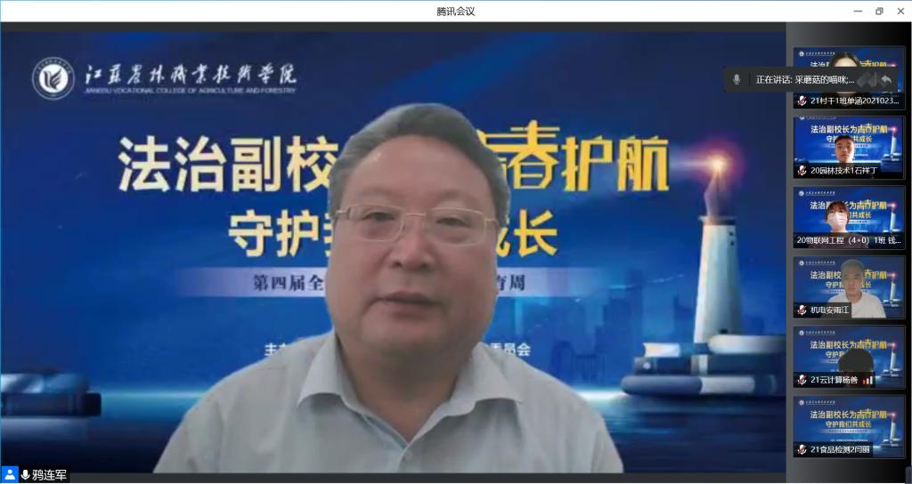 法治副校长、句容市人民检察院党组副书记、副检察长鸦连军开展了以“反有组织犯罪 护航青春成长”为主题的专题讲座。近300名师生在腾讯会议平台听取了讲座。