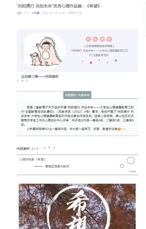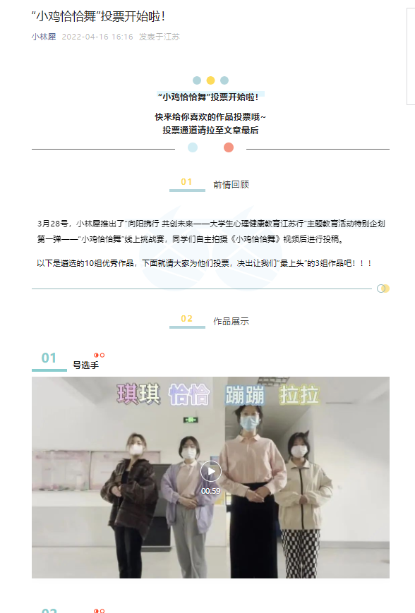 本次系列活动包括心理健康教育系列作品征集与评选、小鸡恰恰舞挑战赛和林犀故事会心理征文活动。在心理健康教育系列作品征集与评选活动中,同学们通过原创音乐、微电影和漫画等形式表达着积极乐观的生活态度;在小鸡恰恰舞挑战赛中,同学们通过对热门视频《小鸡恰恰舞》的创新演绎,展示了疫情之下大学生的青春活力;在林犀故事会中,同学们以爱为主题,讲述着自己和同学、亲人、朋友之间的暖心故事。